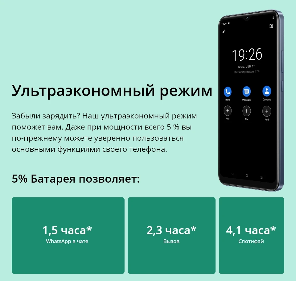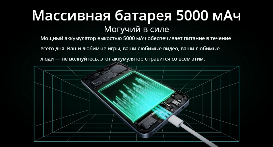 Батарея --------- 5000 мАч Мега батарея, поддерживает ультра режим экономии, поддерживает обратную зарядку