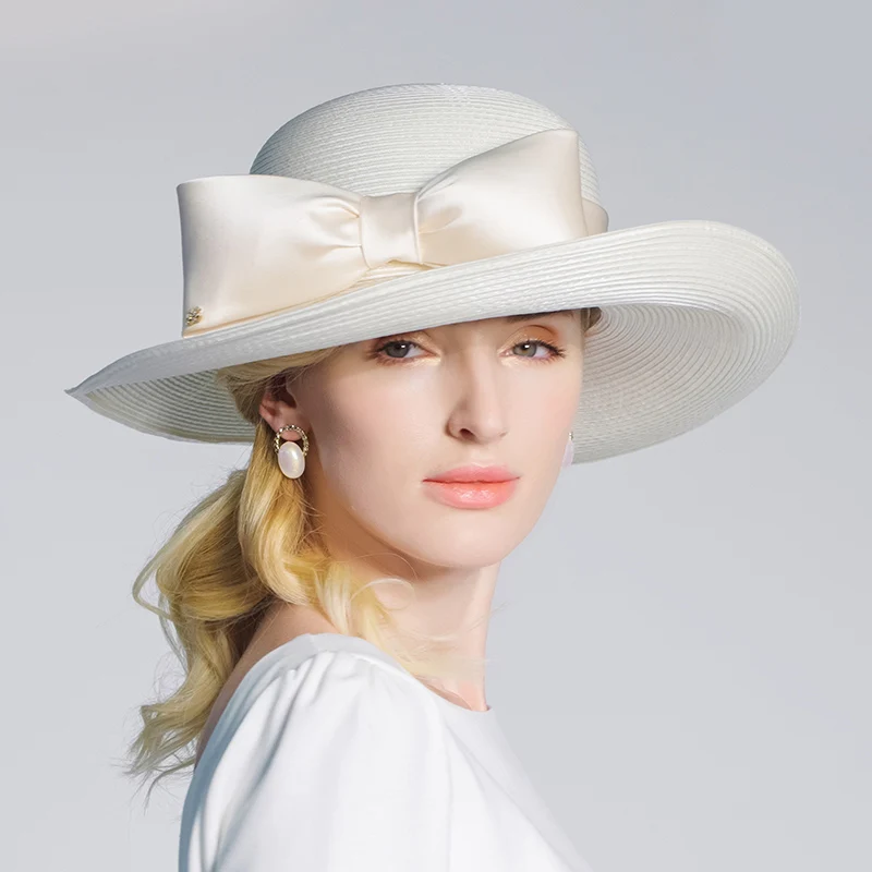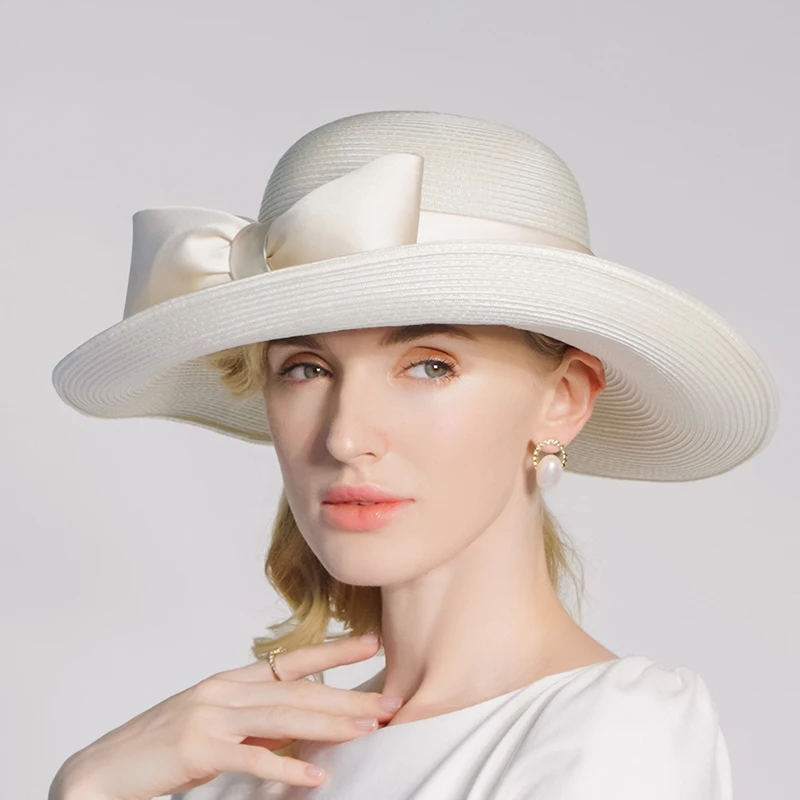 FS Wide Brim Beige Outdoor Sun Visor Hats For Women Big Bow Church Formal Millinery White Cap Silver Gray Fedoras Femme 2023
