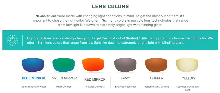 For offshore, blue mirror is the way to go. For sunny day, green mirror and amber are great options. For low light at dawn or dusk, sunrise yellow color is perfect. Gray lenses are the best choice for everyday activities. Of course, the best way for you to decide is to consider your environment.