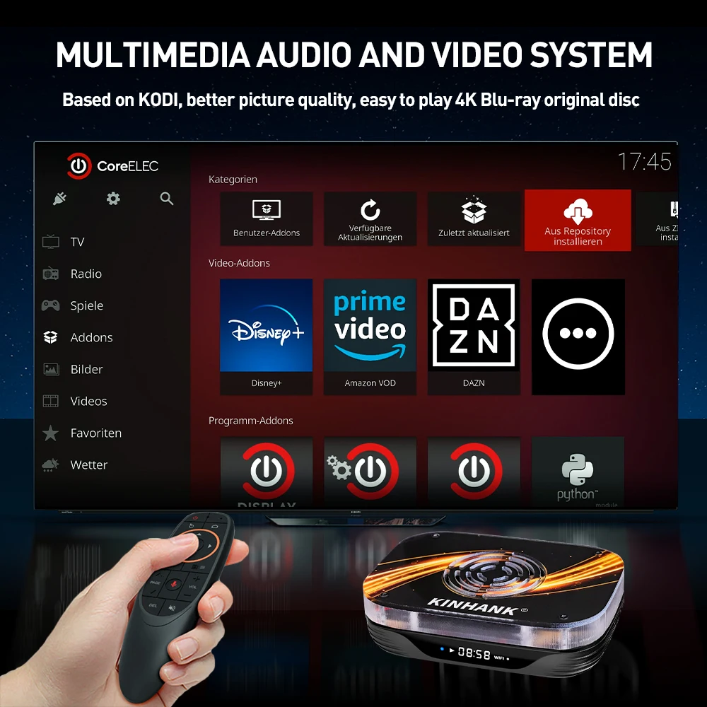 Аудио и видео система CoreELEC может воспроизводить видео плавно, и 4K 60fps 10bit видео с высокой скоростью передачи данных также может воспроизводить плавно: Властелин колец и других 4K UHD BD-remux, И может идеально выводить Dolby Atmos и DIT:S,