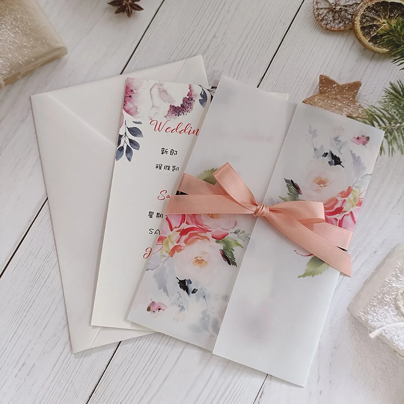 Wrap N Envelope:printed vellum wrap with flower+ ivory matt envelope