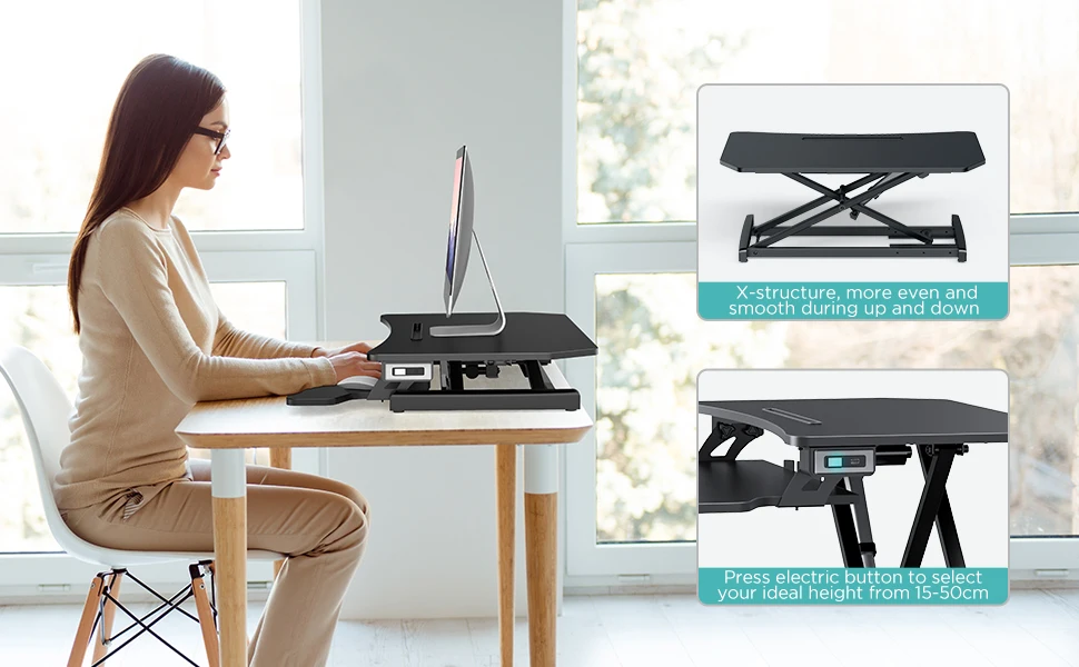 Не нужно нажимать вручную, просто одна клавиша позволяет легко регулировать высоту. Конструкция настольного конвертера с одним касанием облегчает регулировку высоты от сидения до стоя за считанные секунды без ручного нажатия. Регулируемая высота составляет 15-50 см. Электрический стол поднимается и опускается по прямой линии, что экономит пространство и более стабильно, чем ручная пружина подъема газа.