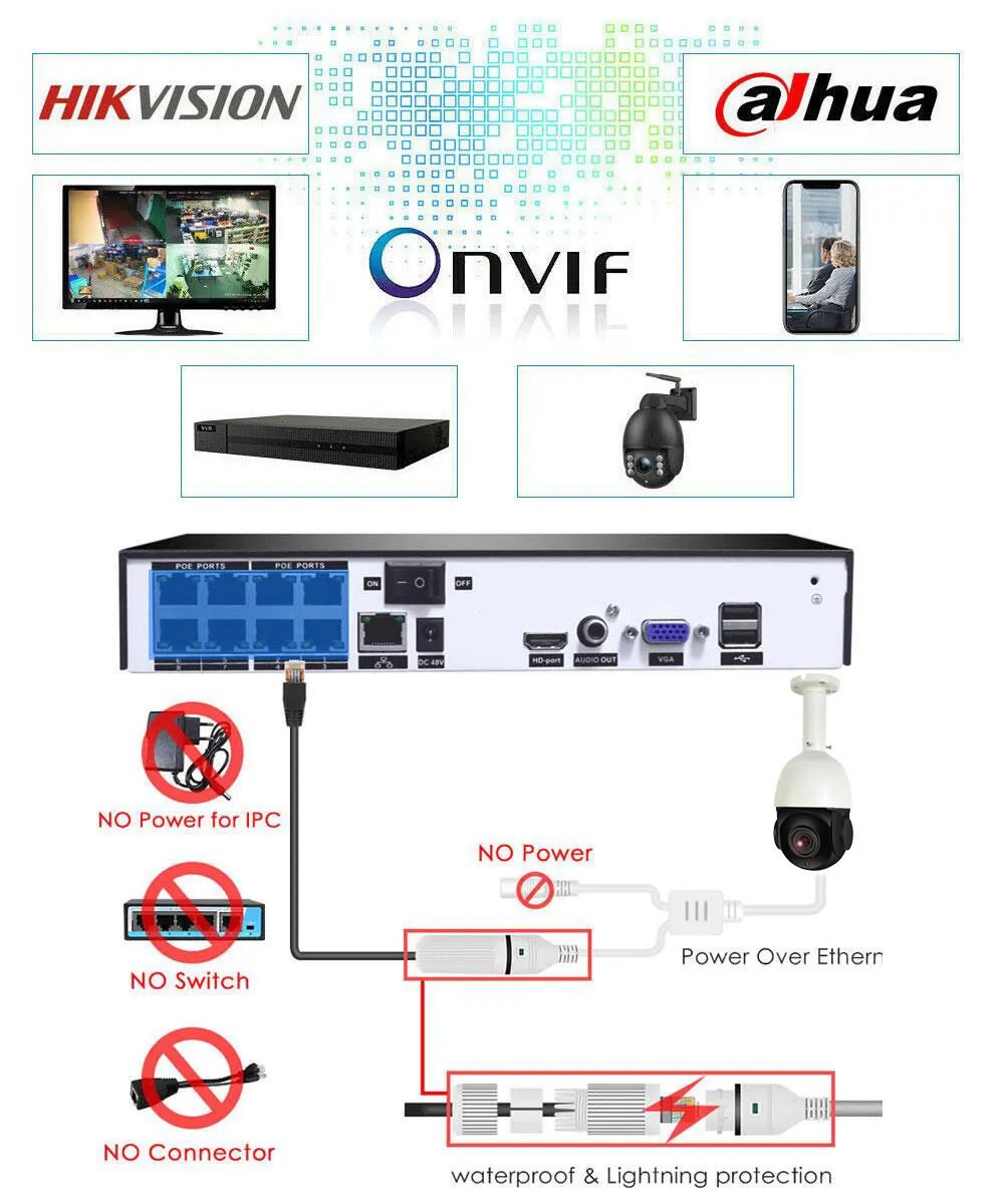 ISpy, Milestone, Digi fort и Blue Iris для просмотра видео. Поддержка протокола Onvif GB/T28281, Совместимость с Hikvision ,Dahua ,XM, Amcrest. Встроенные устройства защиты от перенапряжения и молнии легкий доступ через Бесплатное мобильное устройство