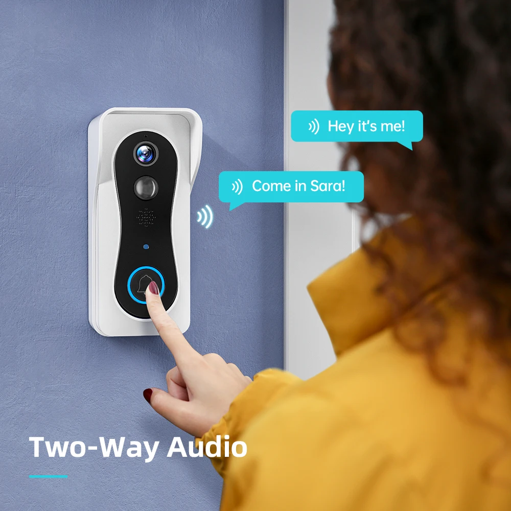 【 2-полосная Аудио & Дистанционное Управление на APP】 встроенный дуплексный микрофон и динамик позволяет в режиме реального времени 2 способ обсуждения и позволяет видеть, слушайте и говорите с посетителями свой мобильный телефон, планшет или ноутбук, где бы вы ни находились, независимо от того, занимаетесь ли вы работой или бегом в парке, Вы можете следить за своей дверью и дистанционно управлять ею в вашем приложении. Более того, вы также можете записывать 3 голосовых сообщения для быстрого ответа посетителю, когда вам неудобно отвечать на телефонные звонки.