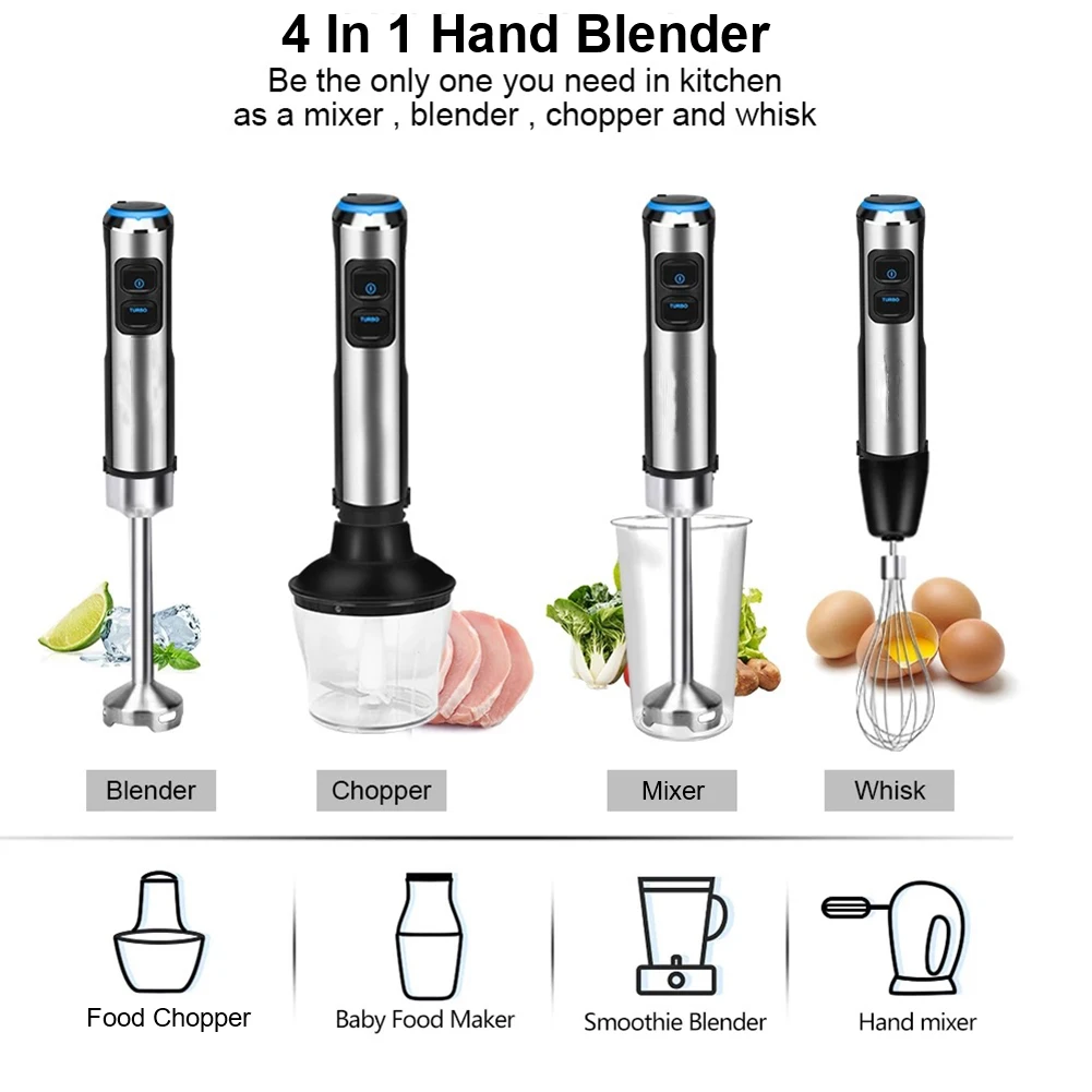 * 1. 4-в-1 ручной блендер из нержавеющей стали 1500 Вт Блендер с 600 мл измельчитель, 800 мл, мерный стакан, и 1 венчик.