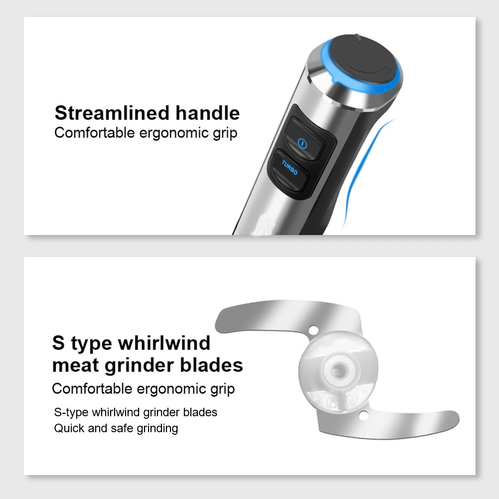 * 4. Обтекаемая Ручка: обеспечивает удобный эргономичный захват. Лезвие циклонной мясорубки s-типа удобно и эргономично, подходит для любого типа контейнера.
