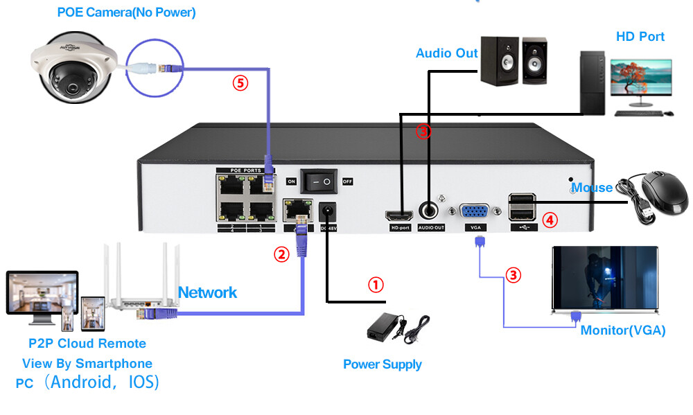 Не нужны дополнительные кабели питания или адаптеры или переключатели. Подключи и работай и простая настройка. Экономьте деньги и удобно, POE NVR = NVR + POE коммутатор