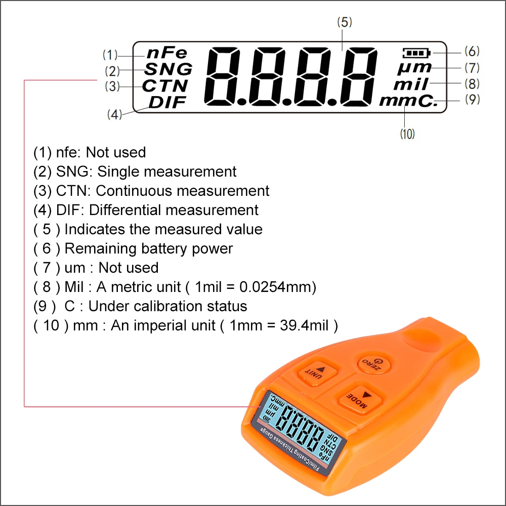Автоматическое отключение экономит электричество три режима измерения: одно измерение, непрерывное измерение и дифференциальное измерение подходит для измерения покрытий на железных, алюминиевых и цинковых метрических и имперских единицах.