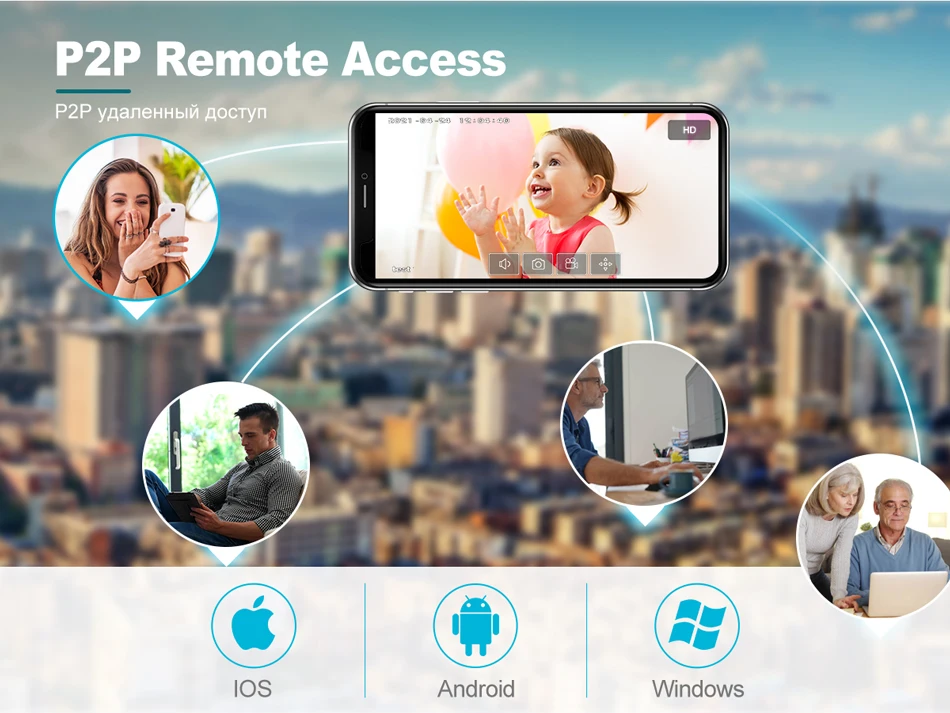 На основе технологии P2P (peer to peer), поддержка установки plug-and-play. Доступ к ip-камере через веб-интерфейс через Интернет-проводник, также поставляется с бесплатным приложением для смартфонов (Android и iPhone) для удаленного просмотра из любого места.