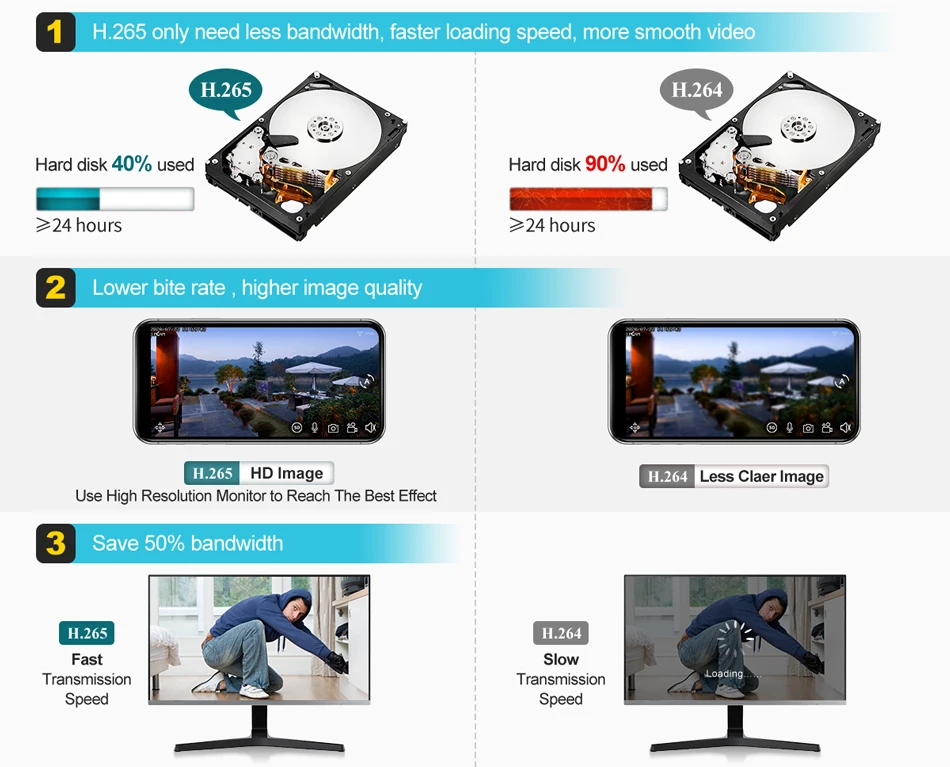 H.265 более четкий, HD разрешение предлагает вам лучшее качество изображения в более низкой скорости.