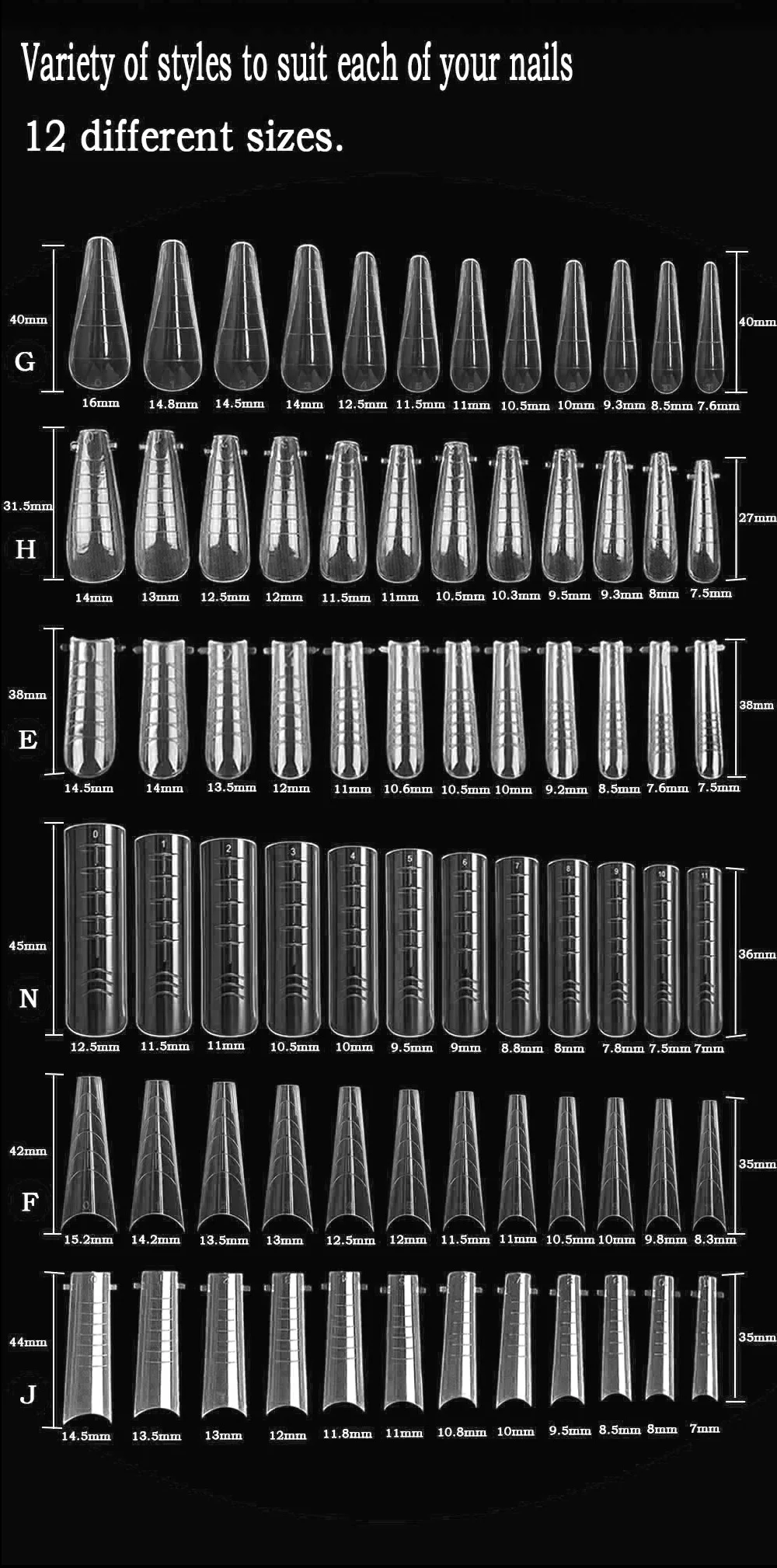 (1). Выберите подходящую форму и размер накладных кончиков для ногтей.