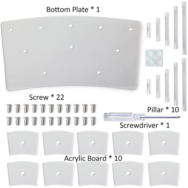 High-Quality Material: Made of thickness acrylic, durable and stable for holding. Suitable for display collections at home or in retail store, the appearance of it will be very eye appealing for your guests or customers. Perfect Design: Our clear design displays your items. 12 layers of columns with different heights can be put at the curio cabinet, retail store, wedding or brithday party, tea party, dining room cabinet, showcase. Multi-function Display: Suitable for small products, collectibles, foods, jewelry and so on. This clear display riser is an great ideal for displaying toy figurines in cabinets, celebrating party desserts, and displaying cosmetics on the dresser. Easy To Assemble: Our acrylic display stand is easy to install. Just screwing in the acrylic legs in few minutes and it is easy to clean and store when you don't use it. PACKAGE INCLUDING: 7 X 2.4 inch display board, 7 X display pillar, 1 X display base, 14 X flat screws, 1 X screwdriver.