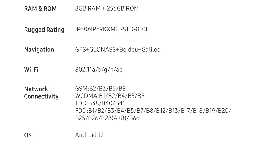 Сертификация -------- IP68 и IP69K/MIL-STD-810H/GMS/ FCC/ CE/ MIC/ IC