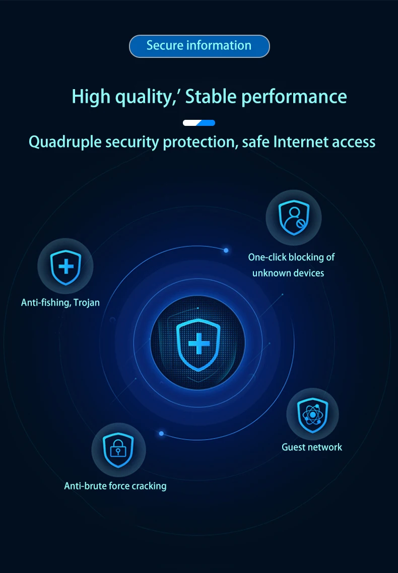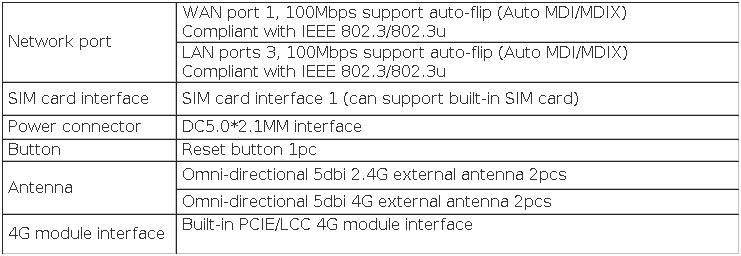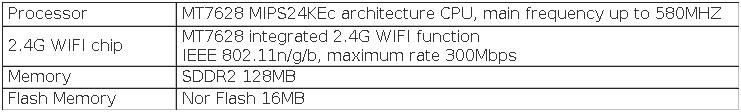 Использование программы MT7628, MIPS24KEc architecture CPU, основная частота до 580 МГц Основной чип Интегрированный baseband 2,4G WIFI скорость до 300 Мбит/с, 128 Мб DDR2 интегрирован в основной чип, с 16 Мб ни флэш 1WAN, 3LAN полный 100 м адаптивный сетевой порт, поддержка авто флип (Авто MDI/MDIX) Поддержка «Режим чистки одной кнопкой», то есть, нажмите кнопку сброса для загрузки в режим очистки при спасении Встроенный чип PCIE/LCC, может использоваться для подключения к модулю связи 4G Внешний стандартный интерфейс sim-карты (большая карта) Внешняя всенаправленная антенна с высоким коэффициентом усиления, беспроводной сигнал на 360 градусов без мертвых концов Автоматическая Перезагрузка устройства, когда система маршрутизации выходит из строя