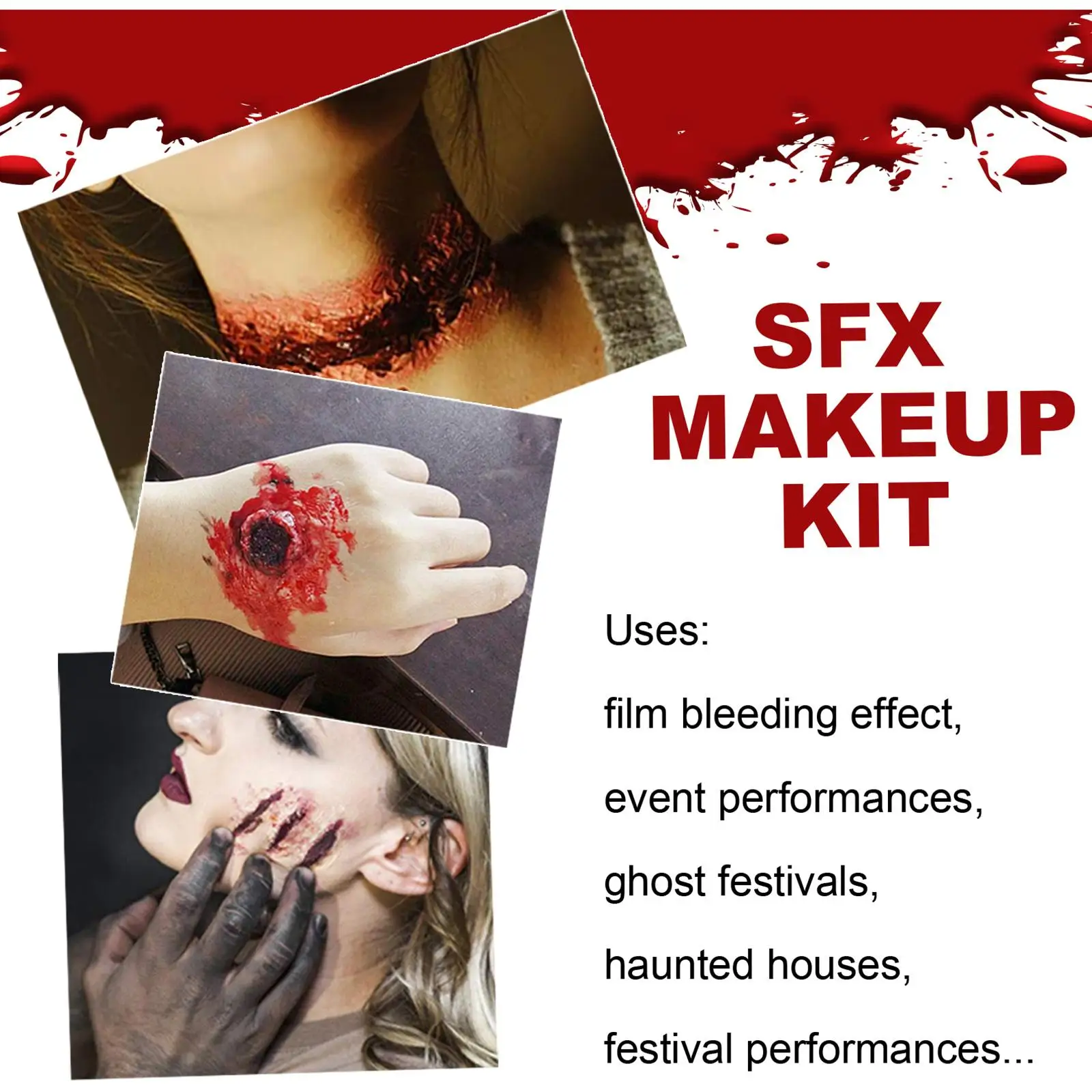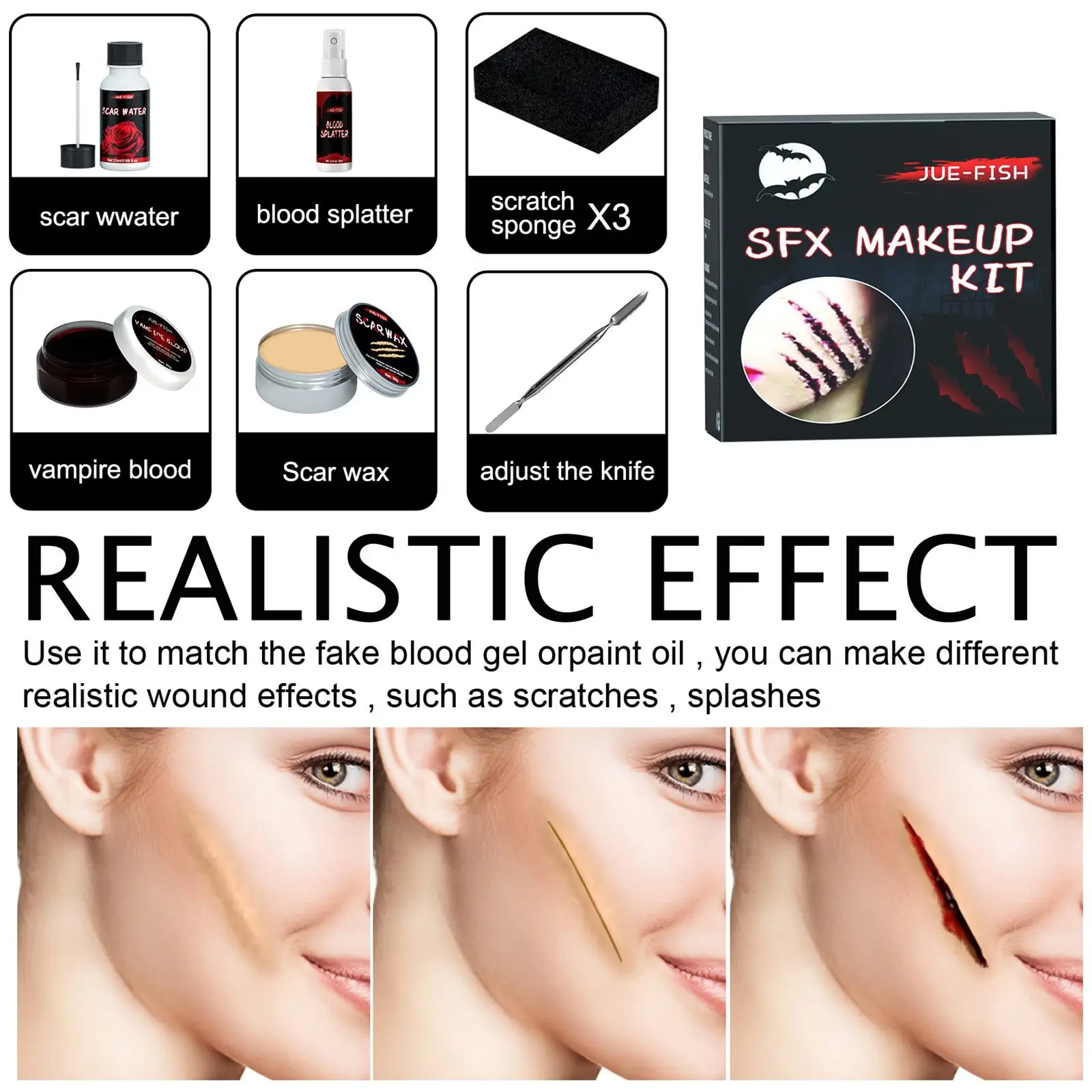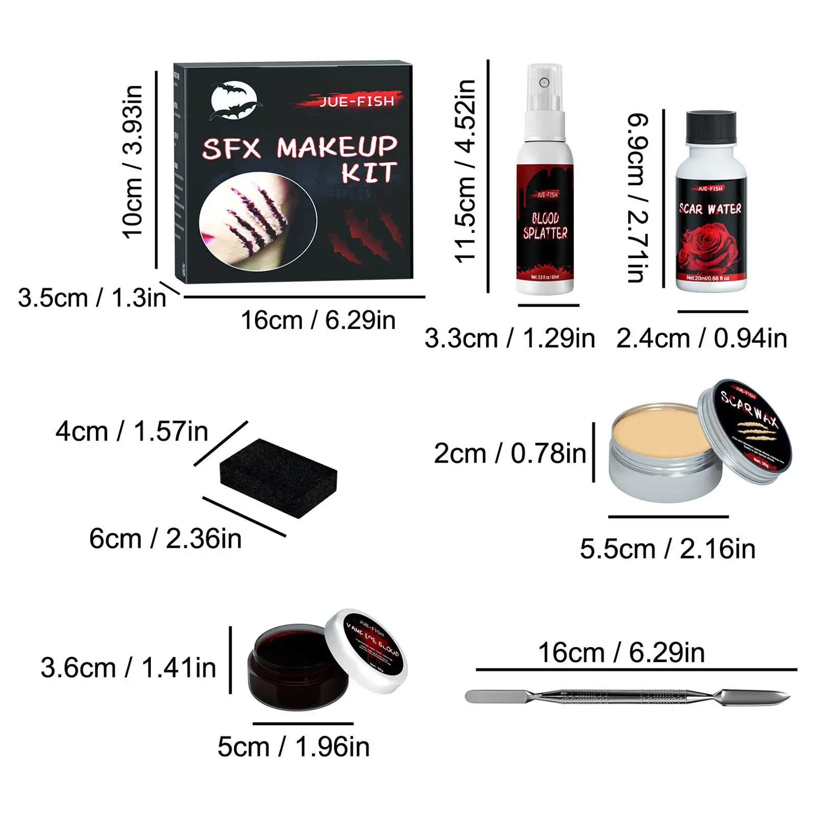 Характеристики: воск для шрамов + поддельный гель для крови + шрамовая вода + поддельный спрей для крови + губка * 3 + серебряный скребок