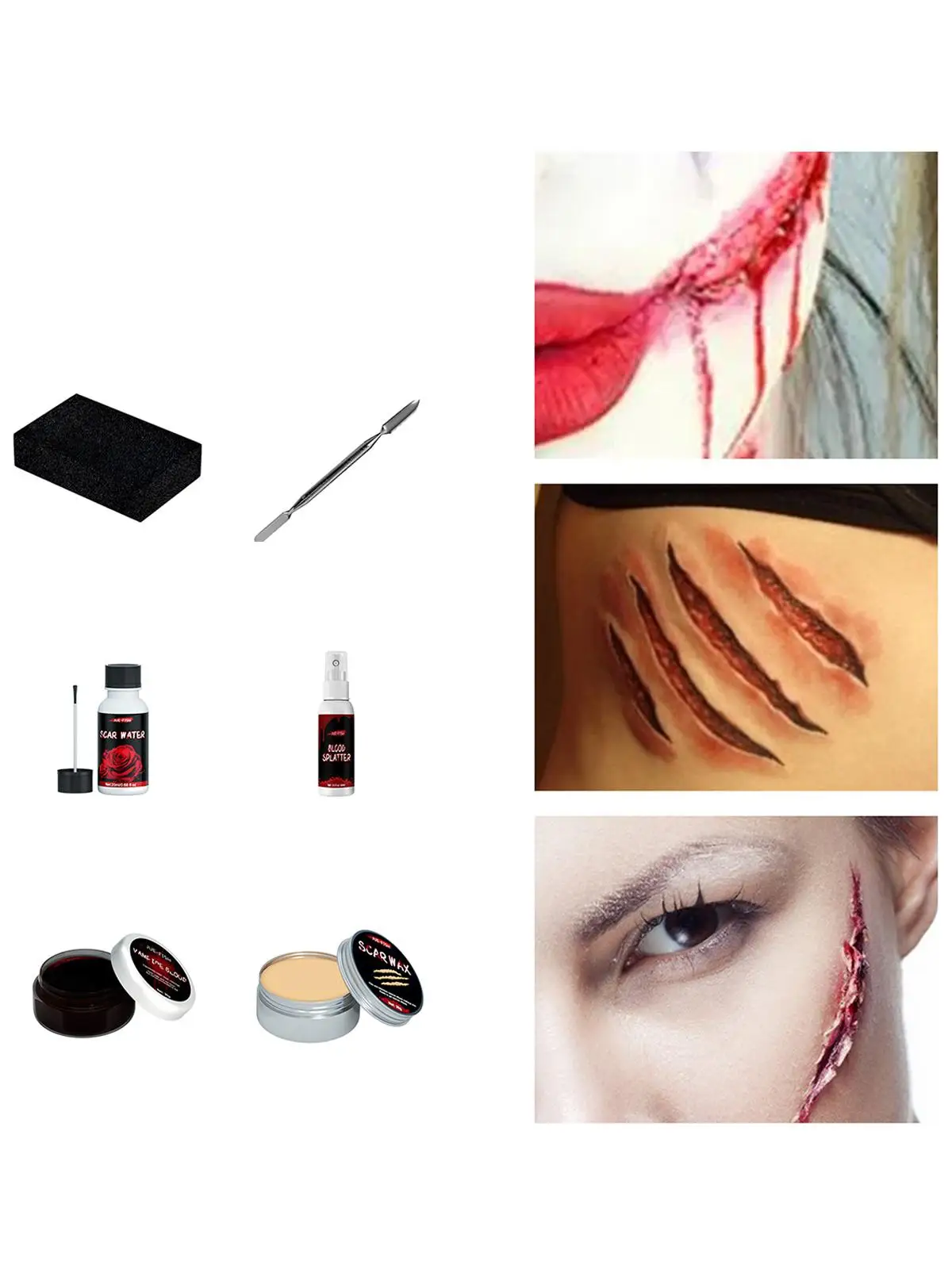 Характеристики: воск для шрамов + поддельный гель для крови + шрамовая вода + поддельный спрей для крови + губка * 3 + серебряный скребок