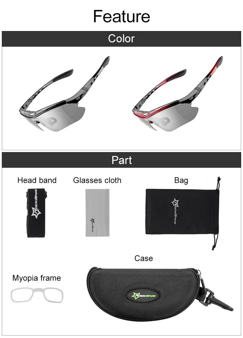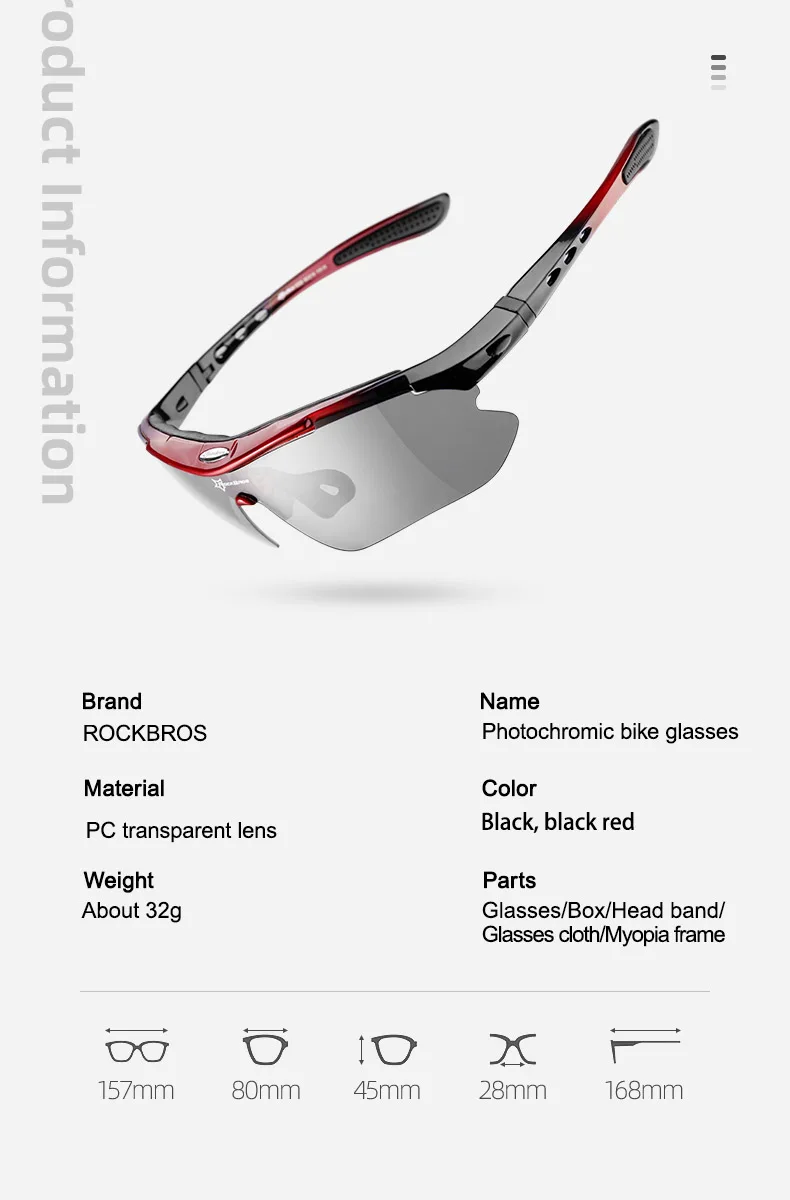 Фирменное наименование: ROCKBROS Вес: около 32g Цвет: красный, черный, Стиль: с фотохромным эффектом, с UV400 солнцезащитные очки для езды на велосипеде, высота линзы: около 4,3 см Объектив Ширина: около 7,5 см Особенности: содержит очки myopia оправа, унисекс, с веревкой