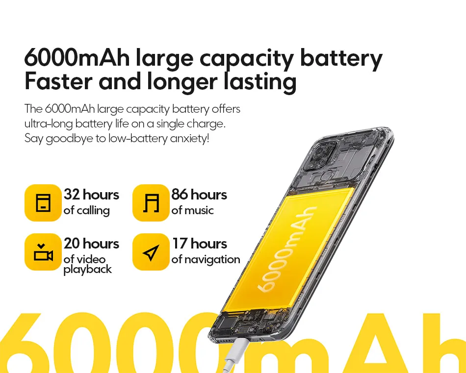 Аккумулятор большой емкости 6000 мА · ч обеспечивает Сверхдолгий Срок службы батареи при одной зарядке. Попрощайтесь с тревогой от низкого заряда батареи!