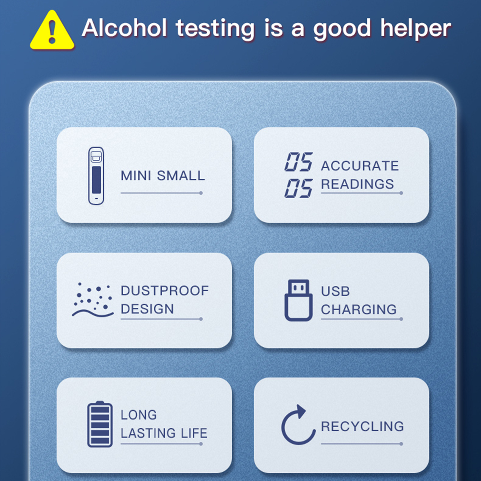 3. Тонкая работа и хорошая производительность. Изготовлен из пластикового материала, детектор алкоголя прочный, прочный и многоразовый. Тестер спирта разработан с помощью сверхчувствительной полупроводниковой сенсорной системы, которая гарантирует, что уровень алкоголя будет определяться в течение нескольких секунд для безопасного вождения.