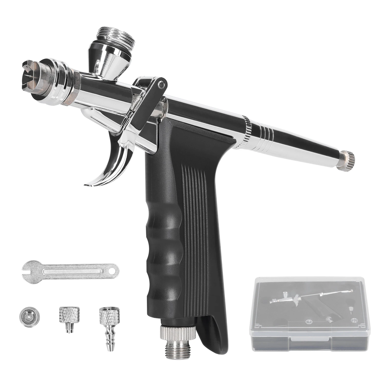 Поставляется с держателем Аэрограф, соединителем шланга, капельницей и мини-гаечным ключом.