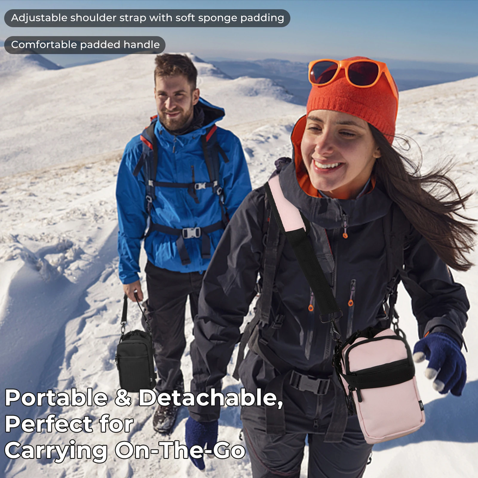 【 2 способа транспортировки: вы можете носить его вручную или натягивать через плечо. Когда вы занимаетесь спортом на открытом воздухе, иногда трудно освободить дополнительные руки, чтобы держать бутылку воды, тогда вы можете использовать мягкий плечевой ремень, чтобы навязать его через плечо.