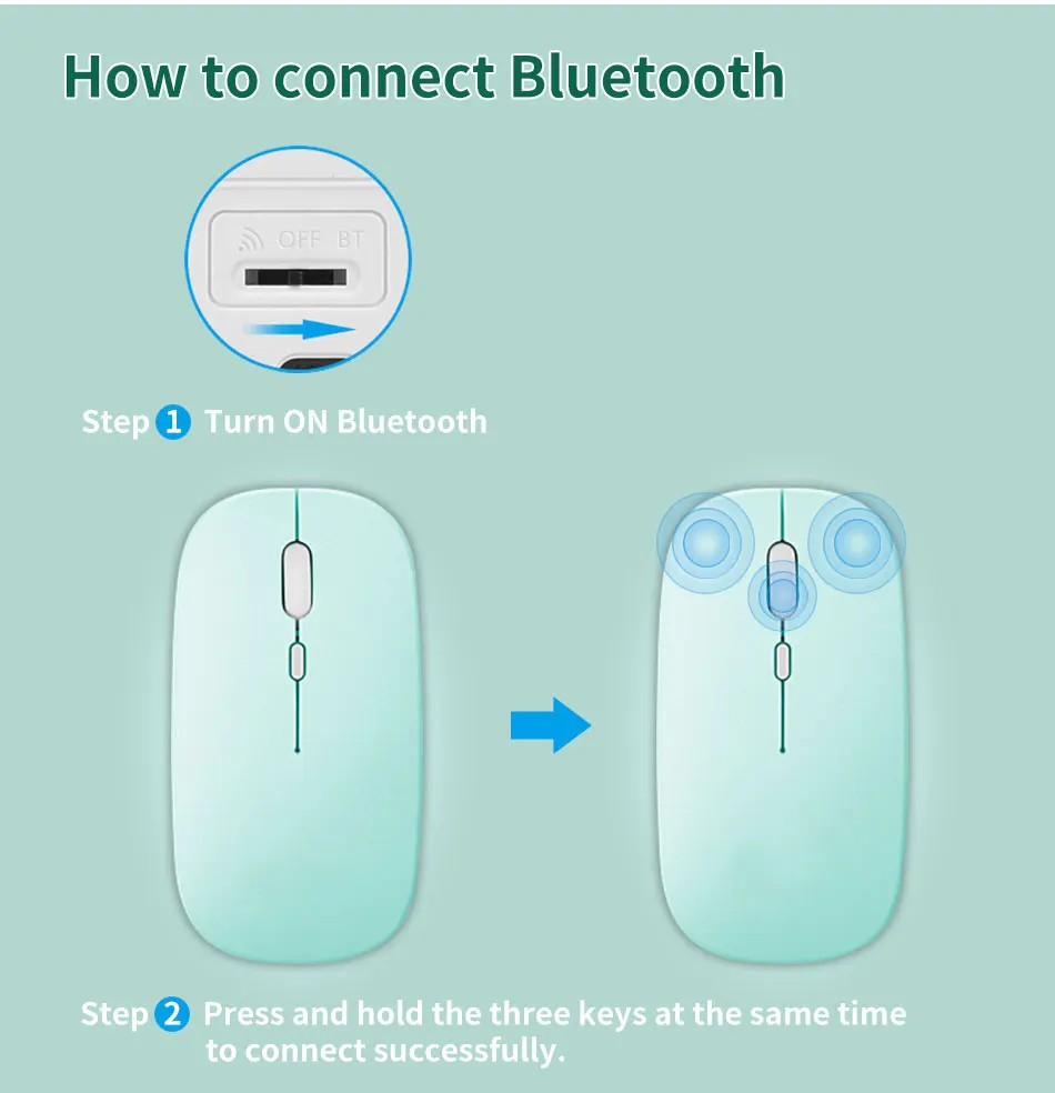 (BT 4,0 + 2,4 GHz): Беспроводная мышь двойного режима реализует Бесплатные переключатели между двумя устройствами с помощью одной мыши только одним щелчком мыши.