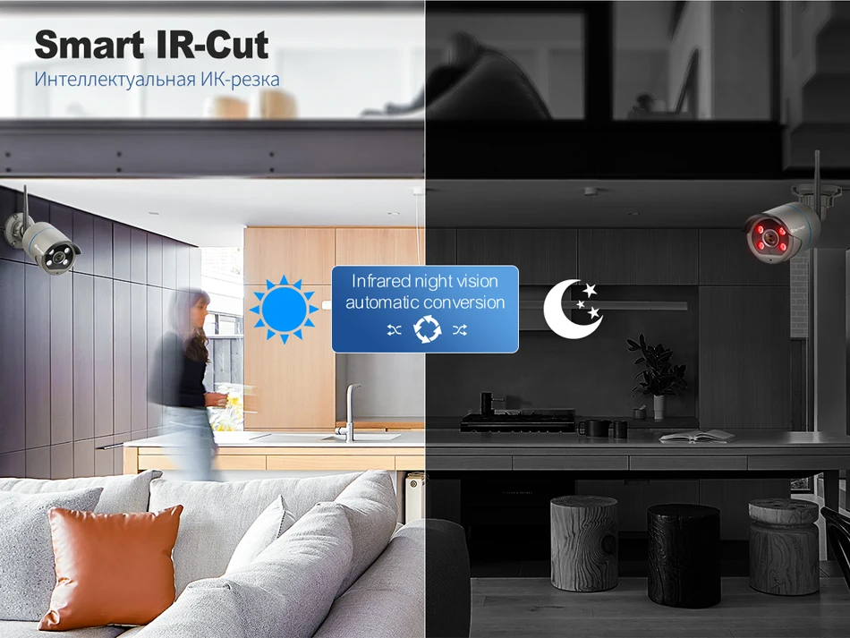 Умный фильтр, отсекающий ИК-спектр автоматически переключается между днем и ночью, чтобы уменьшить цвет в дневное время и повысить яркость изображения ночью, убедившись, что вы можете получить яркие кадры наблюдения от рассвета до темноты