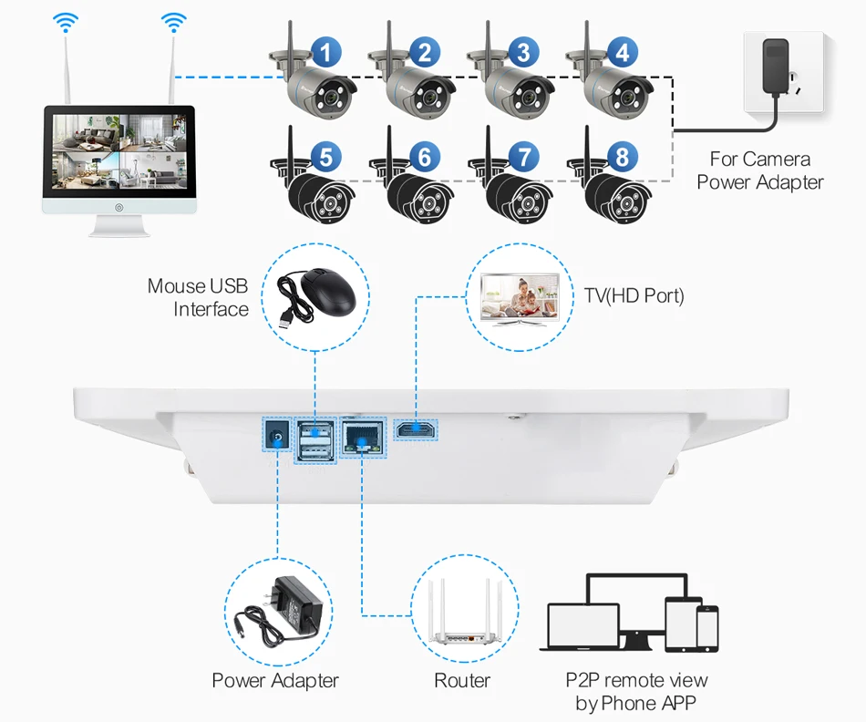 1, 8-канальный NVR дизайн, поддержка подключения до 8 шт камер, вы можете купить Techage Беспроводные ip камеры для расширения вашей системы видеонаблюдения.