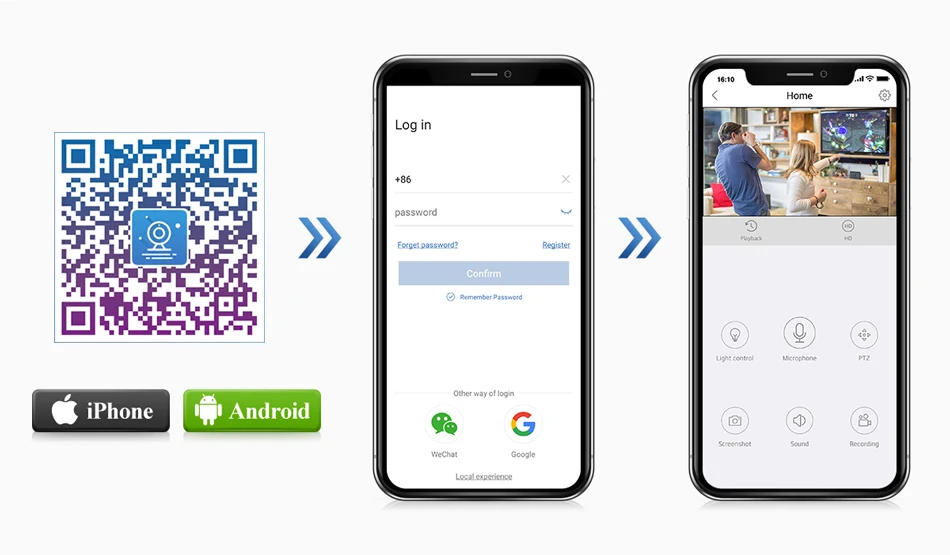 На основе технологии P2P (peer to peer), поддержка установки plug-and-play. Доступ к ip-камере через веб-интерфейс через Интернет-проводник, также поставляется с бесплатным приложением для смартфонов (Android и iPhone) для удаленного просмотра из любого места.