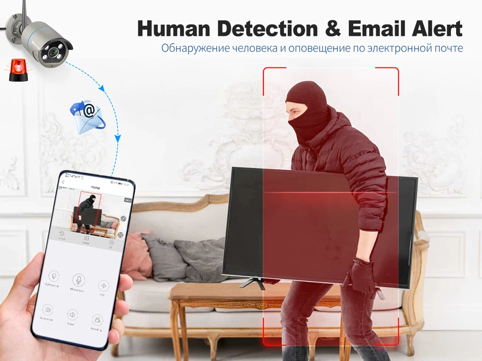 При обнаружении движения человека камера будет автоматически отправлять сигнал тревоги и использовать электронное письмо, чтобы напомнить вам