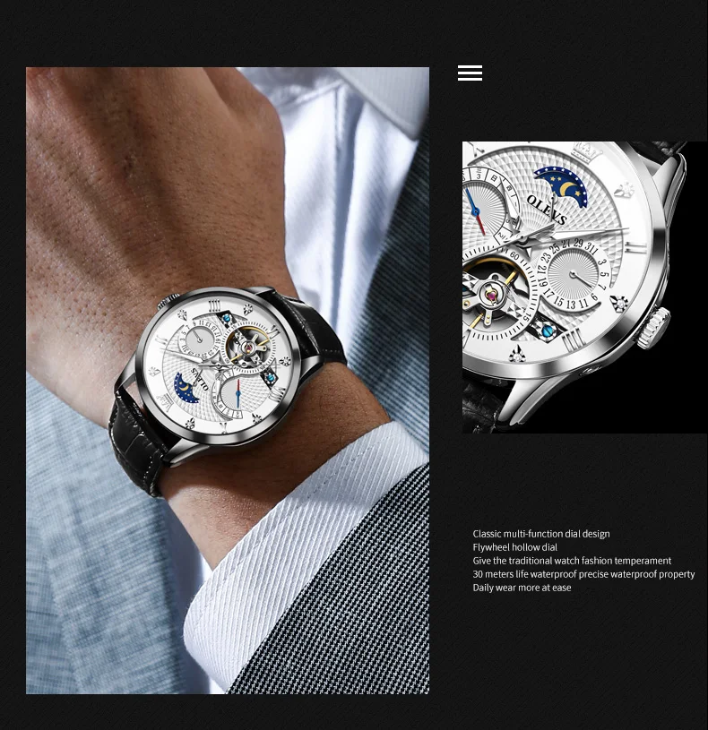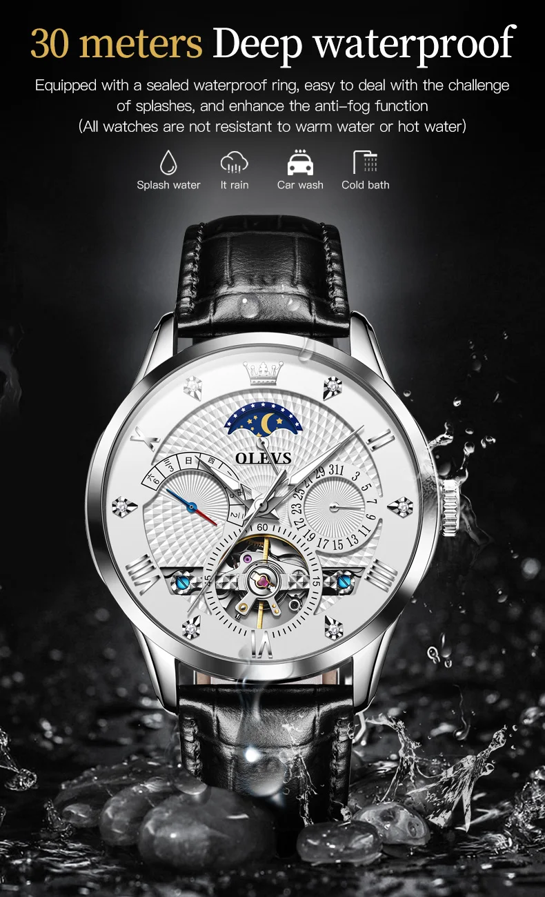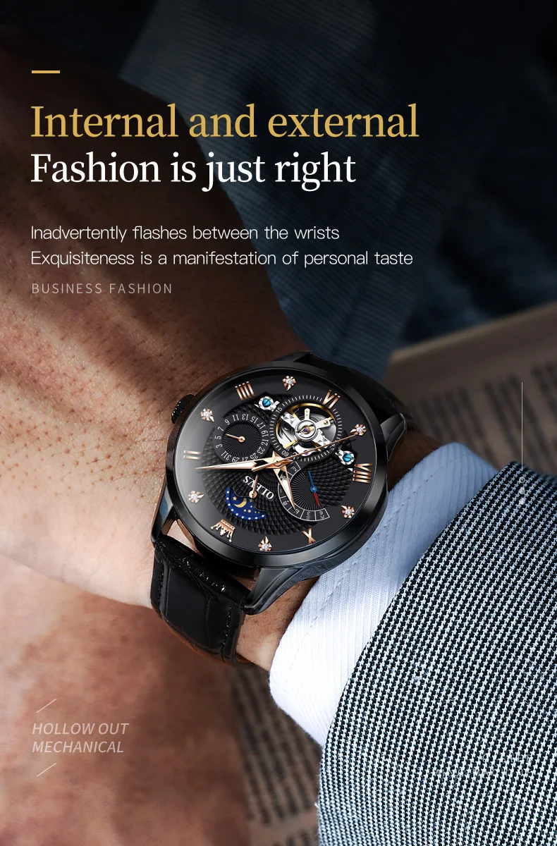 OLEVS бренд Moon Phase часы скелета для мужчин кожаный ремешок бизнес мужские наручные часы водонепроницаемые автоматические механические мужские часы