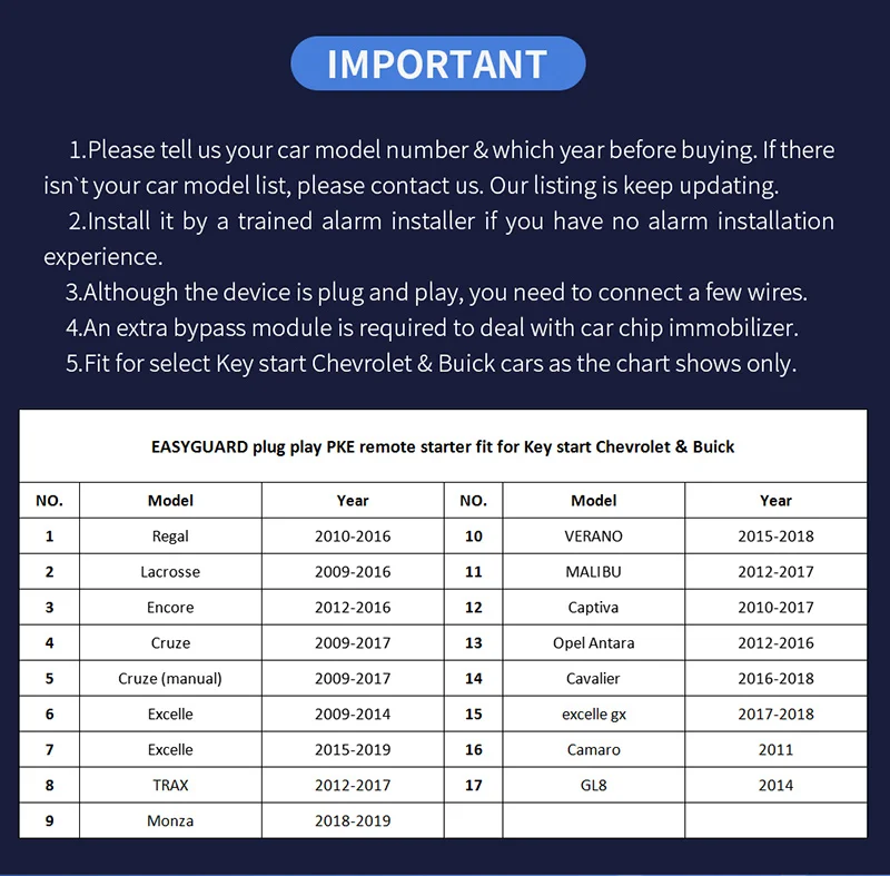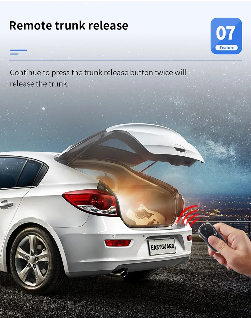 Это интеллектуальная система автосигнализации типа \ "включи и работай \" с пассивным бесключеной, с кнопкой дистанционного запуска двигателя, сенсорной клавиатурой для запуска и автоматическим выводом окна, подходит дляChevrolet CRUZE 2009-2017Бензиновая автоматическая коробка передач и механическая коробка передачАвтомобиль со стандартным ключом только для запуска.