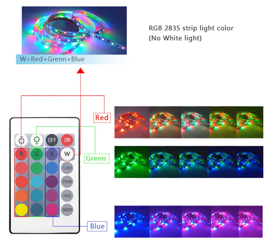 3,3528 RGB светодиодный лента имеет только красный, зеленый, синий три вида одного цвета и несколько смешанных цветов. Если вы хотите, чтобы светодиодный rgb-лента располагала множеством разных цветов, включая белый, теплый белый или желтый одноцветные, пожалуйста, купите светодиодный светильник 5050 RGB.