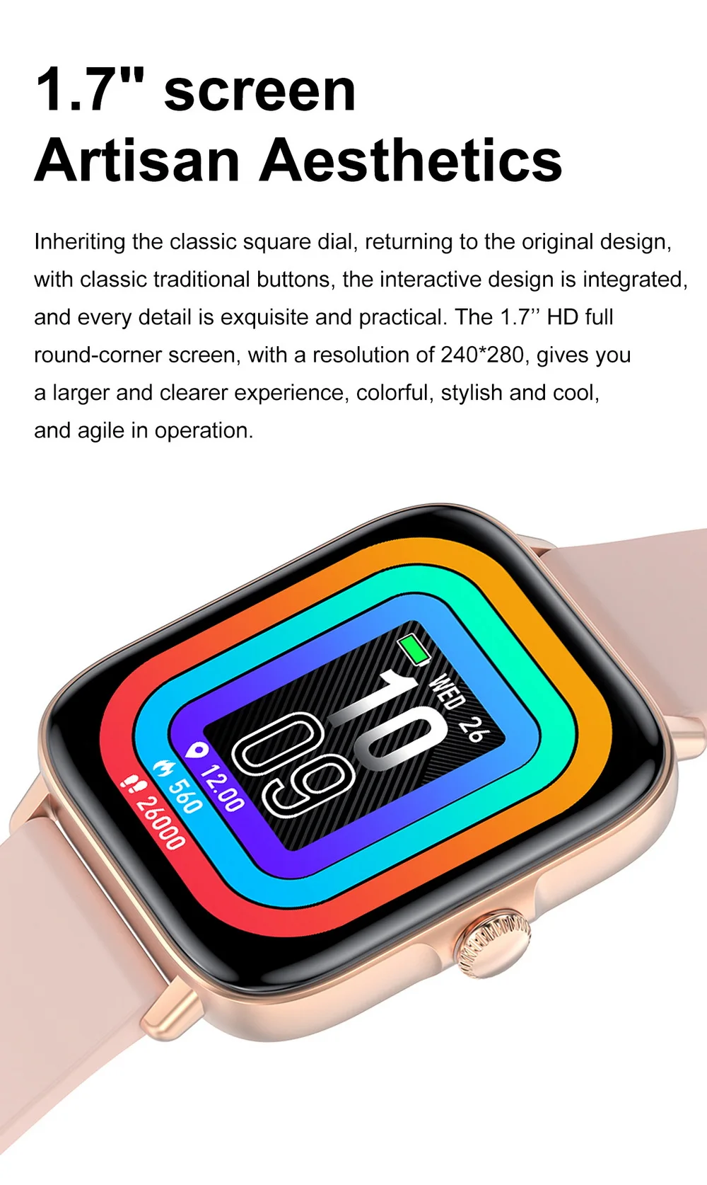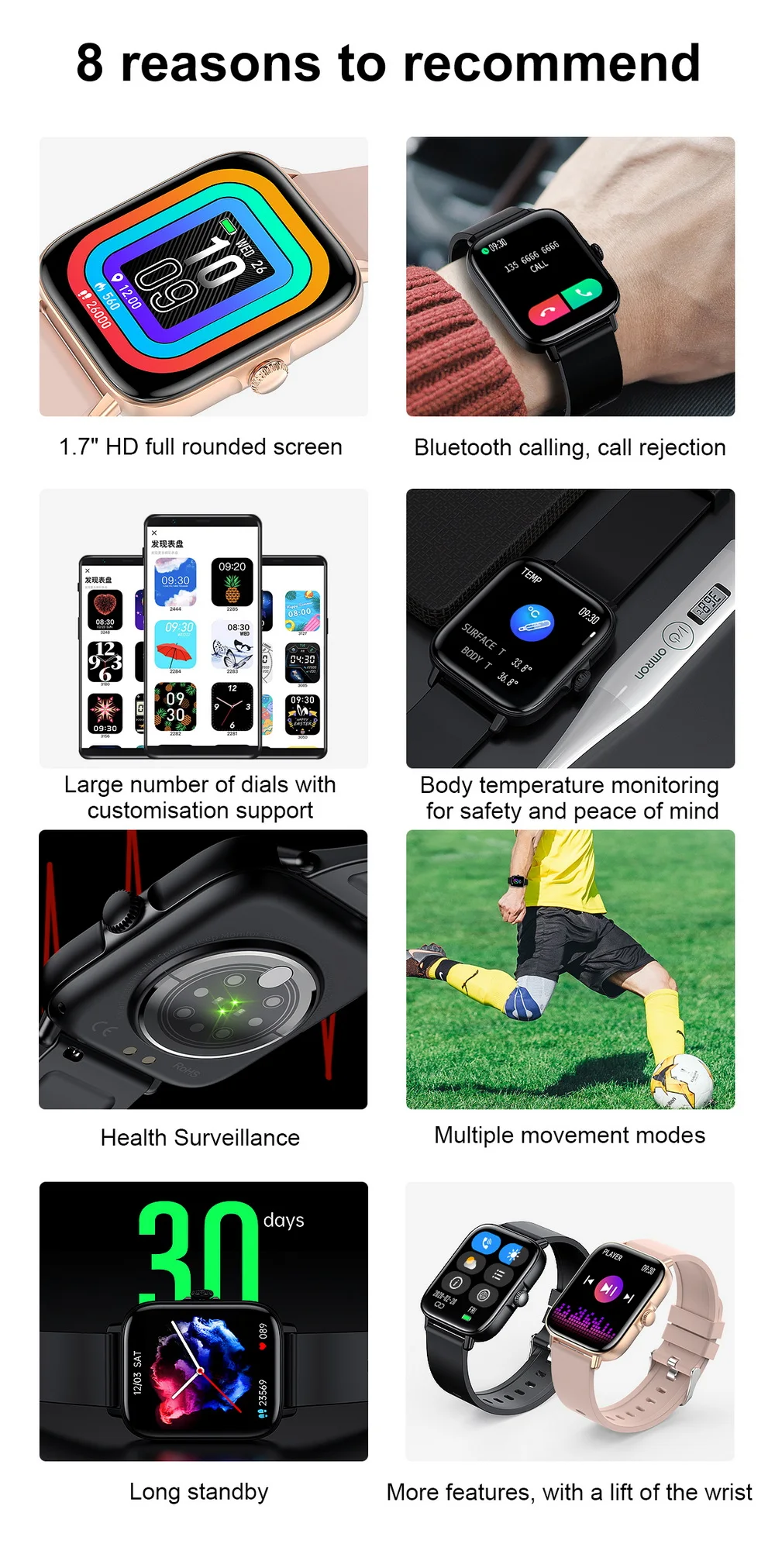 Двухрежимный Bluetooth talk, мониторинг температуры, два набора тем, полноразмерный сенсорный экран 1,70 дюйма, корпус из металлического сплава, мониторинг сердечного ритма, мониторинг артериального давления, мониторинг кислорода в крови, режим мульти-упражнений, пользовательский циферблат, онлайн мульти-циферблат, режим мульти-упражнений, мониторинг сердечного ритма/кровяного давления, мониторинг кислорода в крови, регистрация упражнений. Мониторинг сна, оповещения о сообщениях.