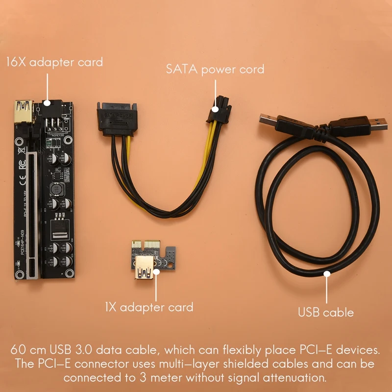 [Прочный кабель для передачи данных]: 60 см USB 3,0 кабель для передачи данных, который может гибко разместить устройства PCI-E. Разъем PCI-E использует Многослойные экранированные кабели и может быть подключен к 3 метру без затухания сигнала.