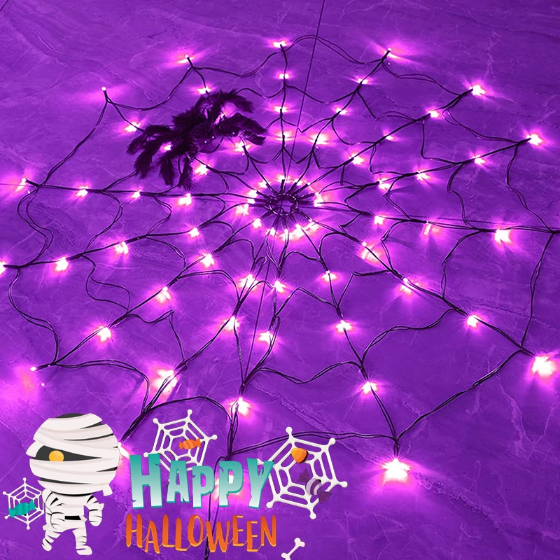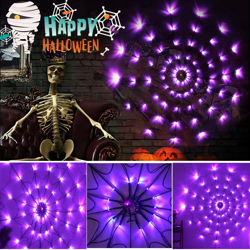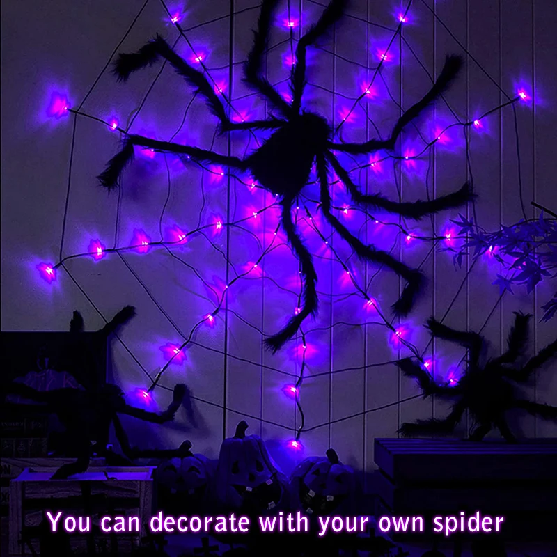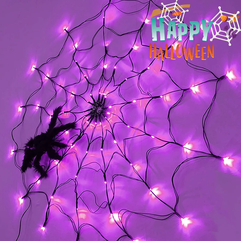 1. Хэллуин лампы: 1,5 м гигантский рисунок паутины, в результате чего 80 фиолетовый светодиодный свет и 12 дюймов реалистичные angry пауков, идеально подходит для украшения в темных углов, садов, заборы, деревья, стены для создания жуткого образа на Хэллоуин.