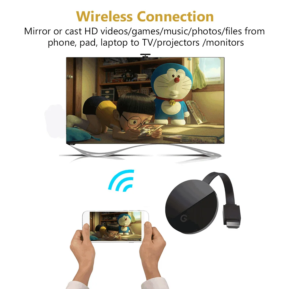Удобное беспроводное соединение. Наш 1080P беспроводной дисплей адаптер литой контент (HD видео/игры/музыка/фотографии/файлы) от вашего смартфона/планшета/ПК/Mac до устройств, совместимых с HDMI, таких как телевизор и проекторы через WiFi, этот беспроводной адаптер дисплея подходит для домашних развлечений/бизнеса/образования/обучения. Делитесь видео, фотографиями, фильмами на большой экран легко.!