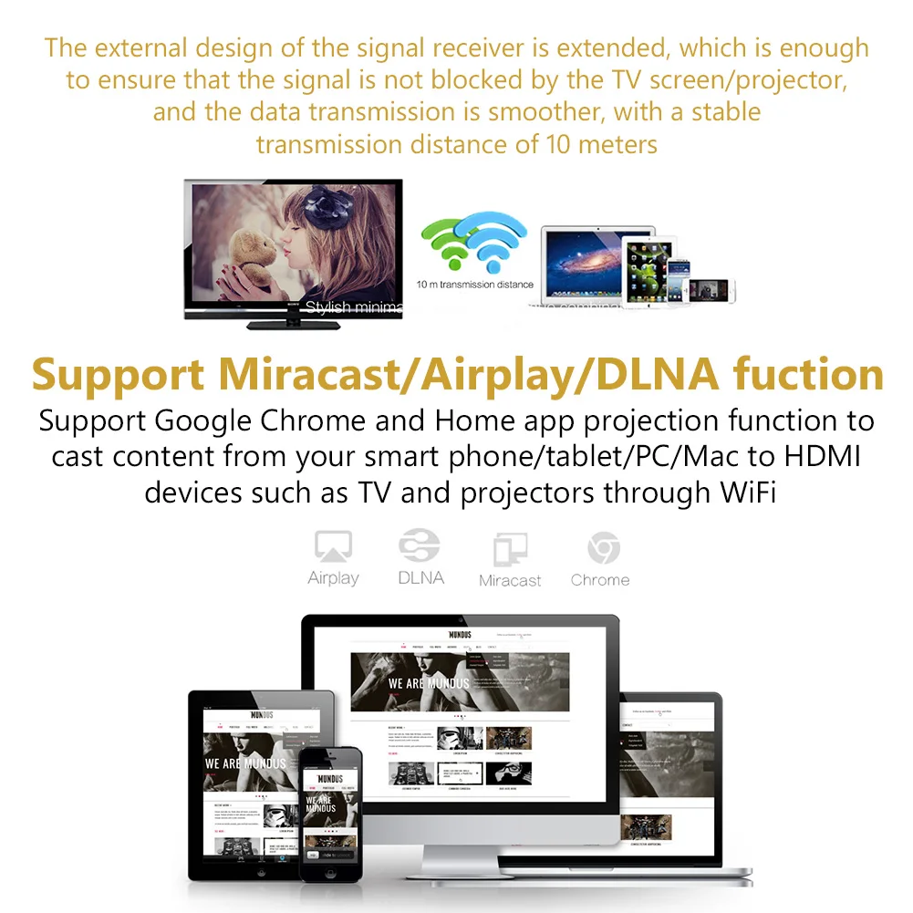 Простота в эксплуатации. Не требуется драйвер приложения или программного обеспечения. Только 3 шага вы можете легко наслаждаться музыкой, Видео, Фото, офисными файлами и веб-сайтом на большом экране: Plug->Connect->Mirror. Подключите его к HDMI-совместимому интерфейсу телевизора и используйте блок питания 5 В/1 А, затем подключите устройство Miracast, Airplay или DLNA режим с инструкциями, наконец зеркало медиа на большом экране.!