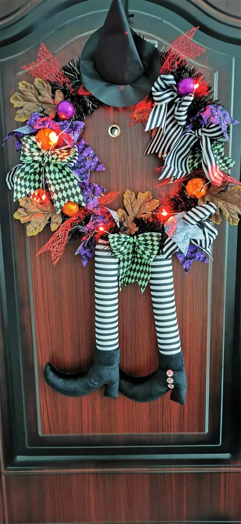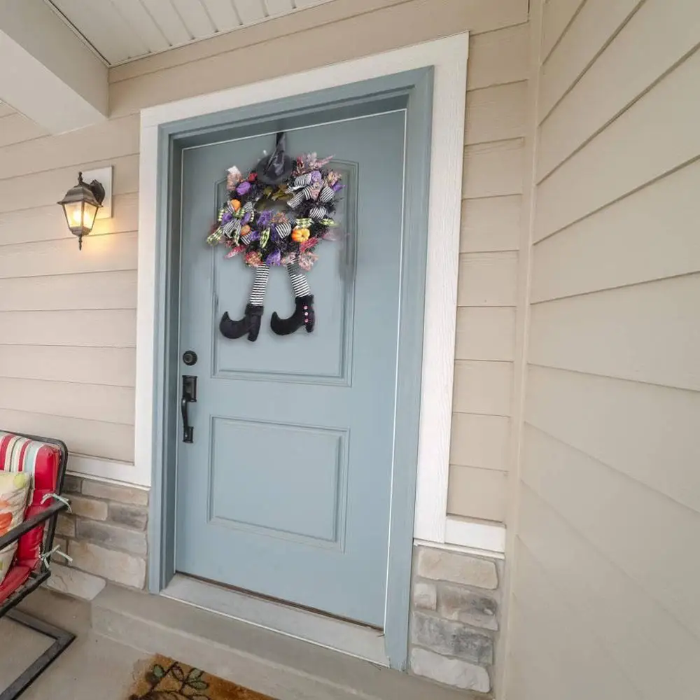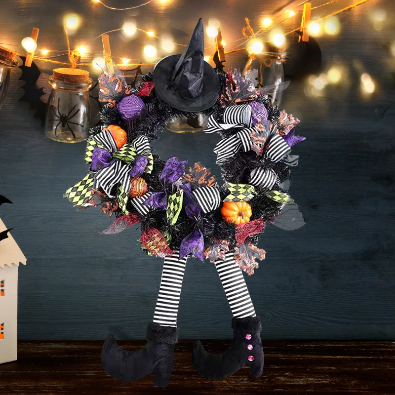 Этот венок на Хэллоуин включает гирлянду, шляпы ведьмы, ножки, пластиковые шары, ленты, кленовые листья, тыквы и прочную металлическую базу, будет интегрирован с темой Хэллоуина.