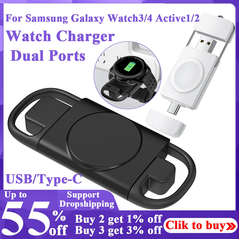 Беспроводные Мини USB Type-C с двумя портами, умные часы, магнитное индукционное зарядное устройство, портативная беспроводная зарядная док-станция для Samsung Galaxy Watch3/4 Active1/2, черный цвет