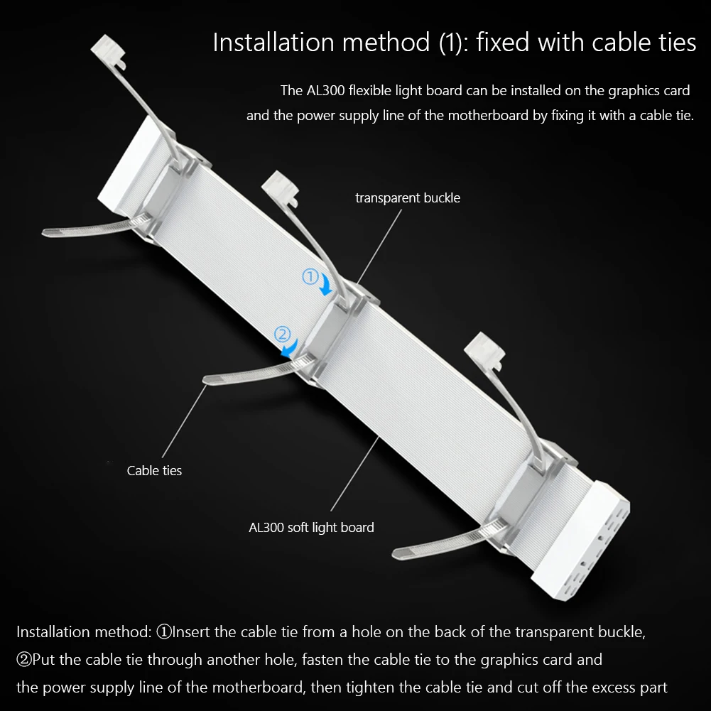 Гибкую световую плату AL300 можно установить на видеокарту и линию питания материнской платы, закрепив ее стяжкой.