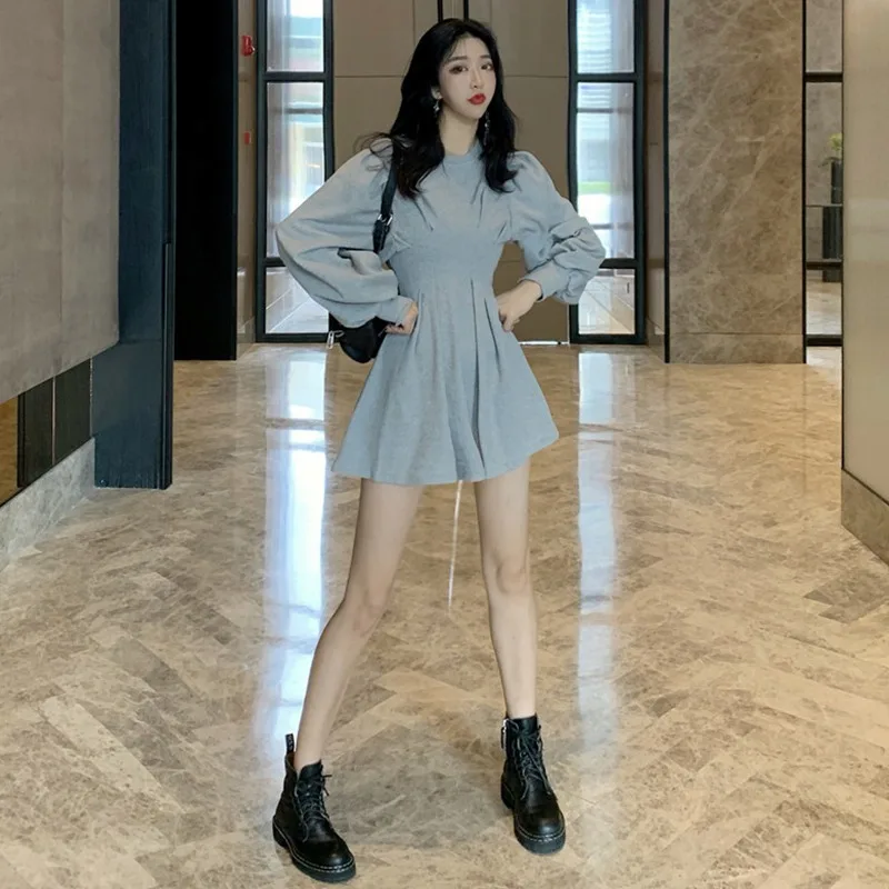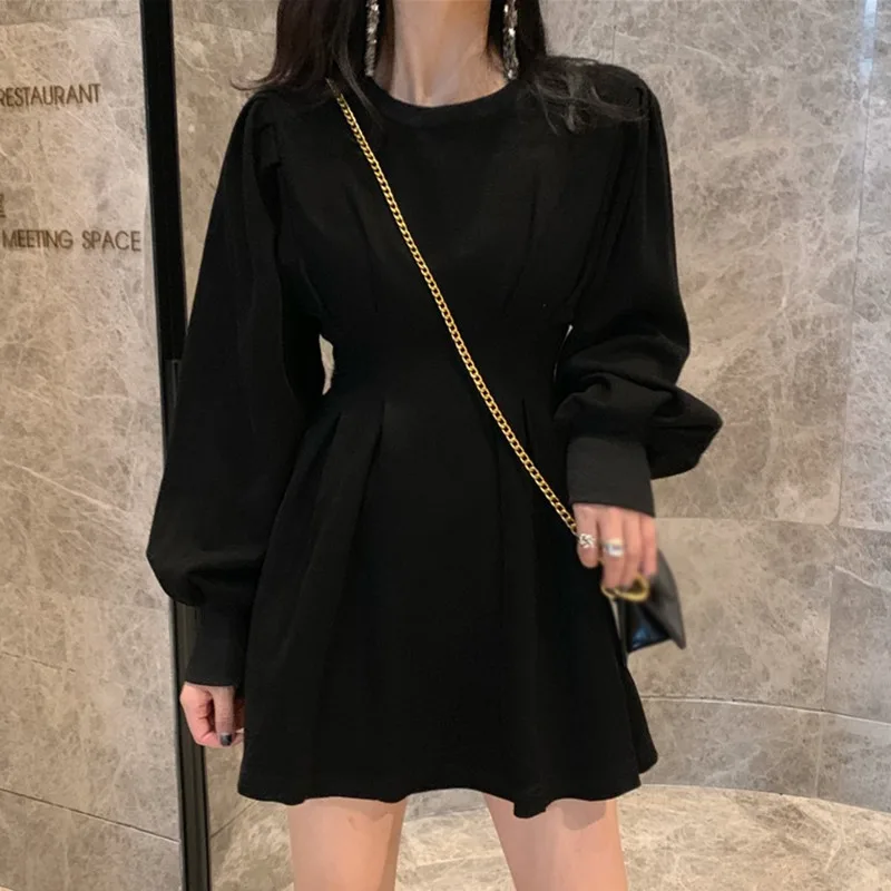 Осенняя мода, корейский стиль, повседневный уличный стиль, шикарное сексуальное Ретро простое однотонное приталенное облегающее платье с круглым вырезом и длинными рукавами