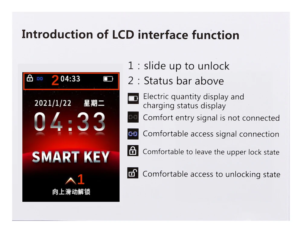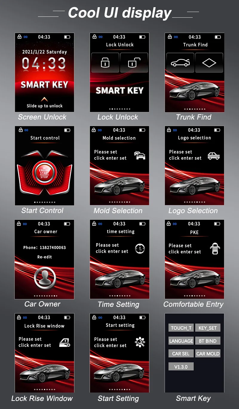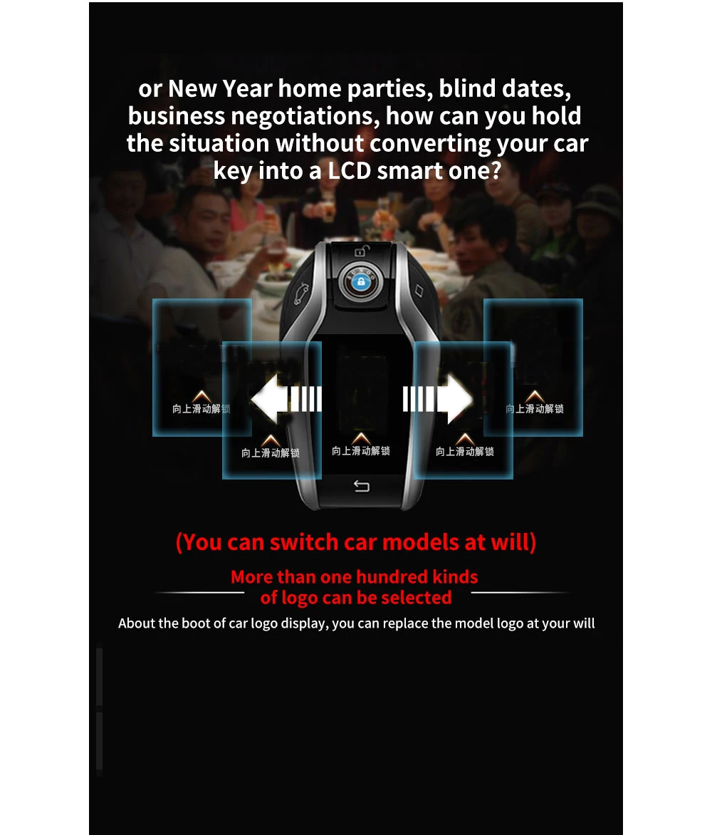 ① Оригинальный Автомобильный ключ изменен на: сенсорный экран + физический ключ ЖК-дисплея, совместим со всеми функциями оригинального автомобильного ключа