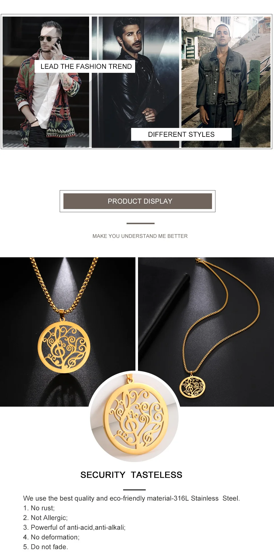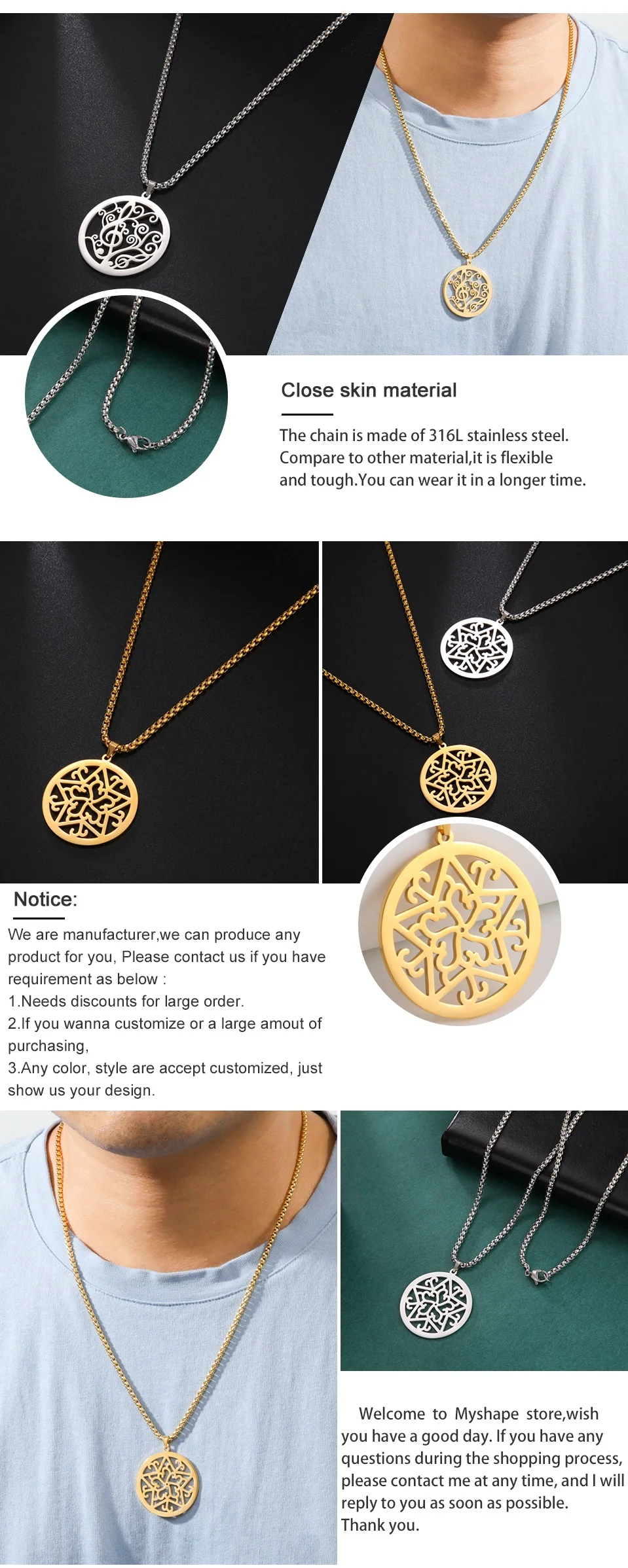 Product Name: My shape Music Note Necklaces for Men Women Star Round Pendant Stainless Steel Necklace Choker Box Chain Fashion Party Jewelry