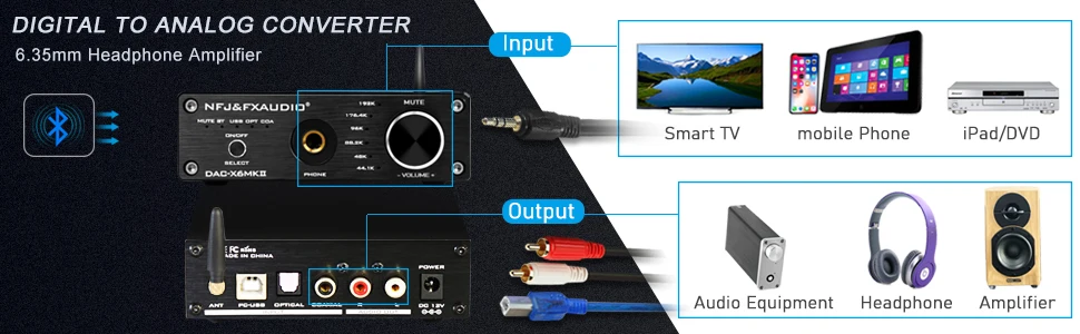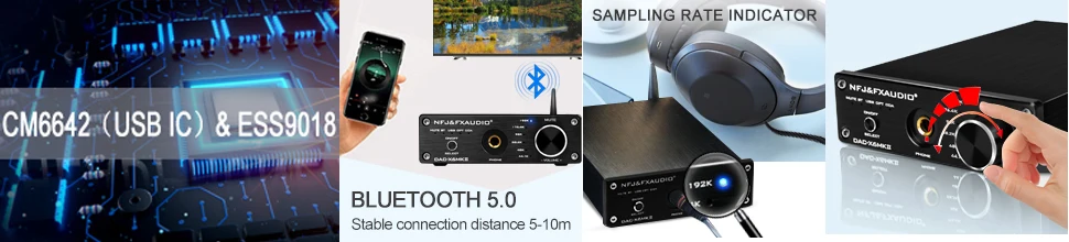 Ключевые части усилителя гарнитуры DAC и цифрового аналогового преобразователя для дома adopt advanced USB IC(CM6642), DAC IC (ESS9018) И высококачественные электронные компоненты для того, чтобы декодер усилителя наушников был более устойчивым к помехам и высоко восстановил качество звука. И вы можете сочетать bluetooth-гарнитуру, чтобы наслаждаться HiFi и динамичной музыкой в любое время.
