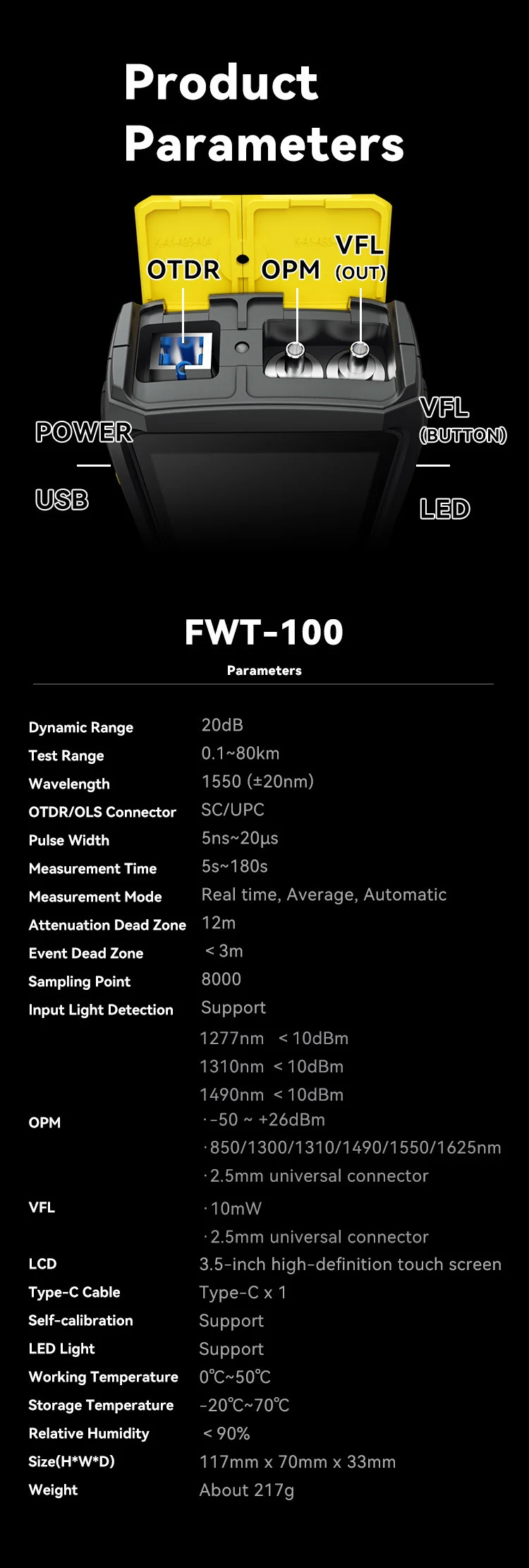 OPM: +26~-50dBm, 850/1300/1310/1490/1550/1625nm, 2.5mm universal connector