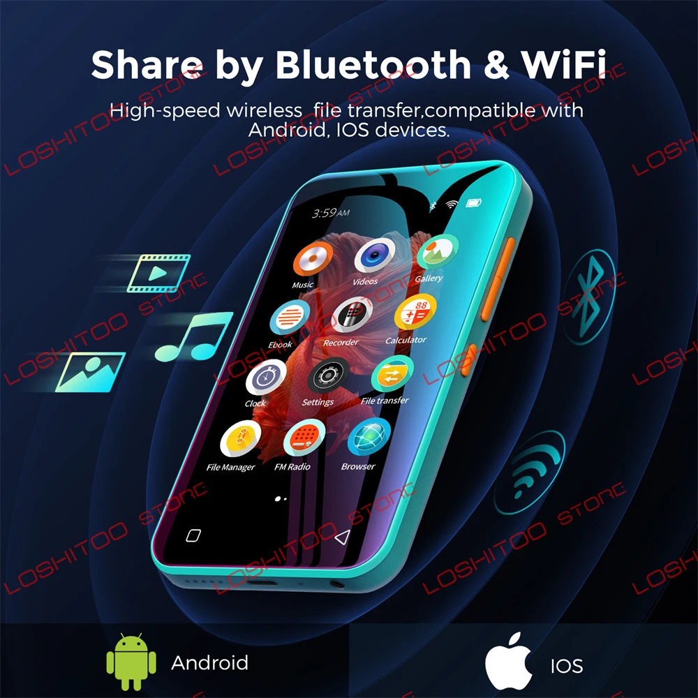 Высокоскоростная Беспроводная передача данных-отличается от большинства текущих MP3-плееров, mp3-плеер Q5 WiFi может не только передавать музыку, видео и изображения с вашего компьютера windows или Mac через USB кабель, но также с вашим смартфоном на базе Android / IOS с помощью предоставленного приложения для передачи файлов.