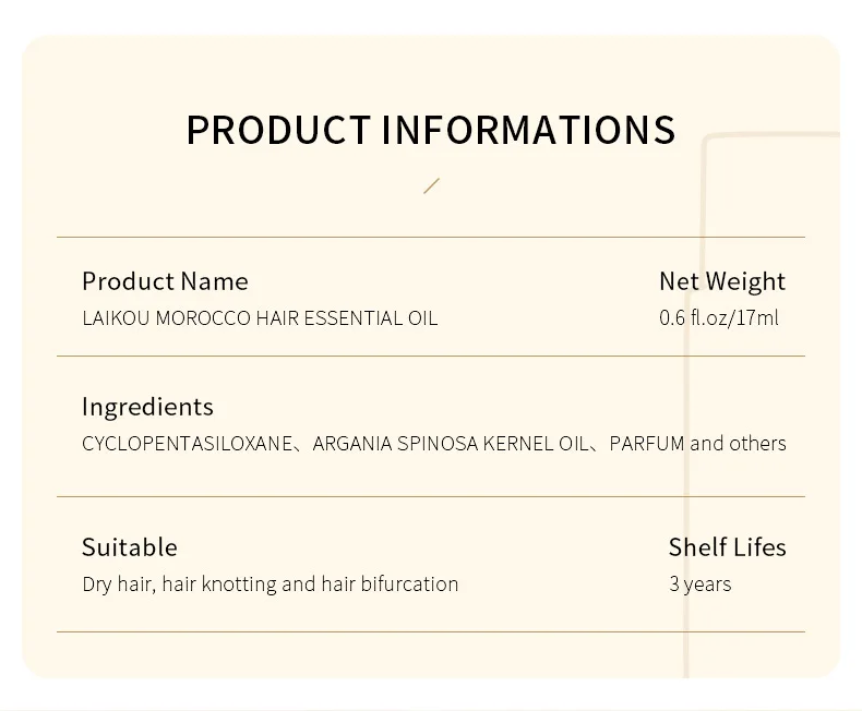Main ingredients: Argania spinosa kernel Oil, essence, etc.