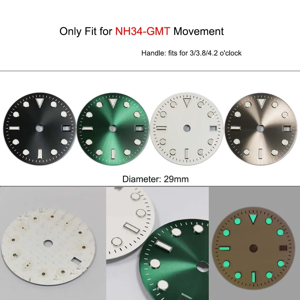Совершенно новый 29 мм 4Pin зеленый светящийся циферблат часовДля Nh34-Gmt движенияМодифицированные циферблаты аксессуары для часов
