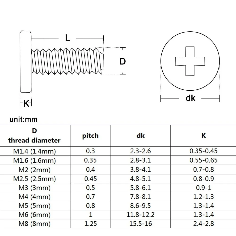 1,4 мм (M1.4) /1,6 мм (1,6 мм) / 2 мм (M2) /2,5 мм (M2.5)